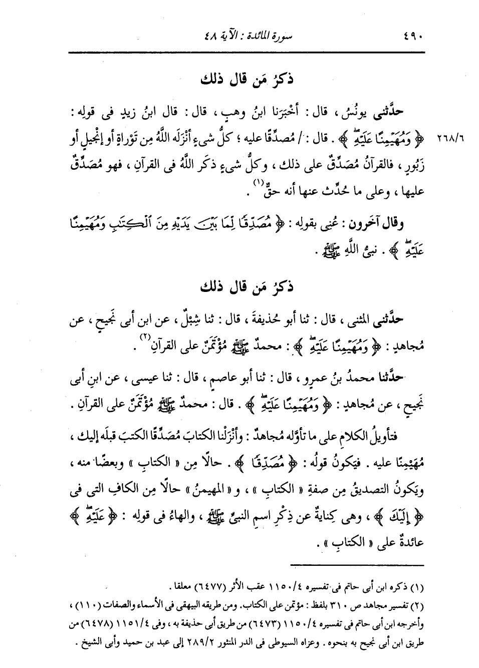 ذِكْرُ مَنْ قَالَ ذَلِكَ: حَدَّثَنِي يُونُسُ , قَالَ: أَخْبَرَنَا ابْنُ وَهْبٍ , قَالَ: قَالَ ابْنُ زَيْدٍ فِي قَوْلِهِ: {§وَمُهَيْمِنًا عَلَيْهِ} [المائدة: 48] قَالَ: «مُصَدِّقًا عَلَيْهِ. كُلُّ شَيْءٍ أَنْزَلَهُ اللَّهُ مِنْ تَوْرَاةٍ أَوْ إِنْجِيلٍ أَوْ زَبُورٍ فَالْقُرْآنُ مُصَدِّقٌ عَلَى ذَلِكَ , وَكُلُّ شَيْءٍ ذَكَرَ اللَّهُ فِي الْقُرْآنِ فَهُوَ مُصَدِّقٌ عَلَيْهَا وَعَلَى مَا حَدَّثَ عَنْهَا أَنَّهُ حَقٌّ» وَقَالَ آخَرُونَ: عَنَى بِقَوْلِهِ: {مُصَدِّقًا لِمَا بَيْنَ يَدَيْهِ مِنَ الْكِتَابِ وَمُهَيْمِنًا عَلَيْهِ} [المائدة: 48] نَبِيَّ اللَّهِ صَلَّى اللهُ عَلَيْهِ وَسَلَّمَ