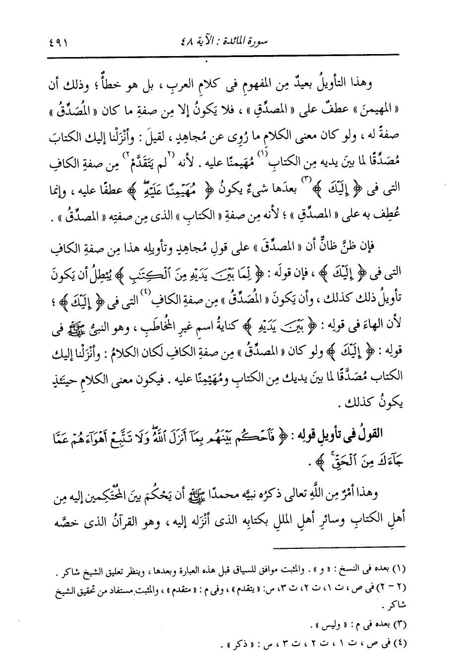 §الْقَوْلُ فِي تَأْوِيلِ قَوْلِهِ تَعَالَى: {فَاحْكُمْ بَيْنَهُمْ بِمَا أَنْزَلَ اللَّهُ وَلَا تَتَّبِعْ أَهْوَاءَهُمْ عَمَّا جَاءَكَ مِنَ الْحَقِّ} [المائدة: 48] وَهَذَا أَمْرٌ مِنَ اللَّهِ تَعَالَى ذِكْرُهُ لِنَبِيِّهِ مُحَمَّدٍ صَلَّى اللهُ عَلَيْهِ وَسَلَّمَ أَنْ يَحْكُمَ بَيْنَ الْمُحْتَكِمِينَ إِلَيْهِ مِنْ أَهْلِ الْكِتَابِ وَسَائِرِ أَهْلِ الْمِلَلِ , بِكِتَابِهِ الَّذِي أَنْزَلَهُ إِلَيْهِ , وَهُوَ الْقُرْآنُ الَّذِي خَصَّهُ