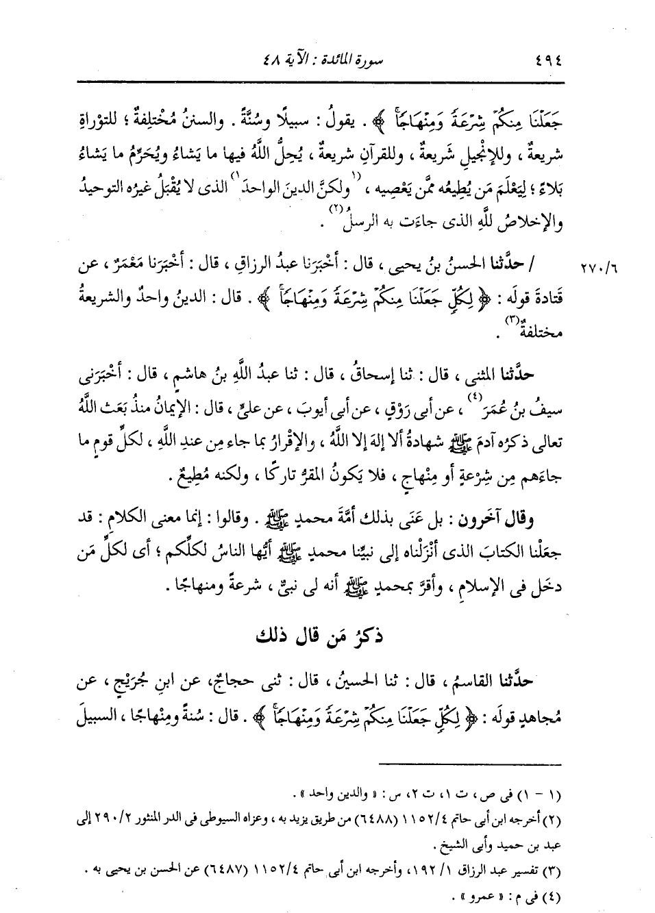 حَدَّثَنَا الْمُثَنَّى , قَالَ: ثنا إِسْحَاقُ , قَالَ: ثنا عَبْدُ اللَّهِ بْنُ هَاشِمٍ , قَالَ: أَخْبَرَنَا سَيْفُ بْنُ عُمَرَ , عَنْ أَبِي رَوْقٍ , عَنْ أَبِي أَيُّوبَ , عَنْ عَلِيٍّ , قَالَ: الْإِيمَانُ مُنْذُ بَعَثَ اللَّهُ تَعَالَى ذِكْرُهُ آدَمَ صَلَّى اللهُ عَلَيْهِ وَسَلَّمَ شَهَادَةُ أَنْ لَا إِلَهَ إِلَّا اللَّهُ , وَالْإِقْرَارُ بِمَا جَاءَ مِنْ عِنْدِ اللَّهِ , §لِكُلِّ قَوْمٍ مَا جَاءَهُمْ مِنْ شِرْعَةٍ أَوْ مِنْهَاجٍ , فَلَا يَكُونُ الْمُقِرُّ تَارِكًا وَلَكِنَّهُ مُطِيعٌ " وَقَالَ آخَرُونَ: بَلْ عَنَى بِذَلِكَ أُمَّةَ مُحَمَّدٍ صَلَّى اللهُ عَلَيْهِ وَسَلَّمَ. وَقَالُوا: إِنَّمَا مَعْنَى الْكَلَامِ: قَدْ جَعَلْنَا الْكِتَابَ الَّذِي أَنْزَلْنَاهُ إِلَى نَبِيِّنَا مُحَمَّدٍ صَلَّى اللهُ عَلَيْهِ وَسَلَّمَ أَيُّهَا النَّاسُ لِكُلِّكُمْ: أَيْ لِكُلِّ مَنْ دَخَلَ فِي الْإِسْلَامِ وَأَقَرَّ بِمُحَمَّدٍ صَلَّى اللهُ عَلَيْهِ وَسَلَّمَ أَنَّهُ لِي نَبِيُّ , شِرْعَةً وَمِنْهَاجًا.