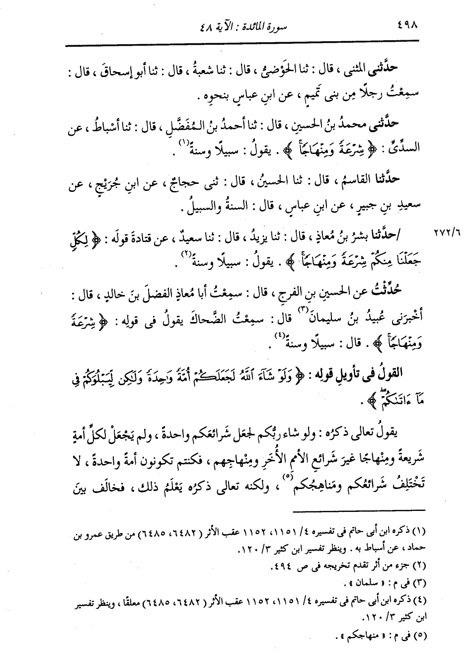 حَدَّثَنِي مُحَمَّدُ بْنُ الْحُسَيْنِ , قَالَ: ثنا أَحْمَدُ بْنُ الْمُفَضَّلِ , قَالَ: ثنا أَسْبَاطٌ , عَنِ السُّدِّيِّ: {§شِرْعَةً وَمِنْهَاجًا} [المائدة: 48] يَقُولُ: «سَبِيلًا وَسُنَّةً»