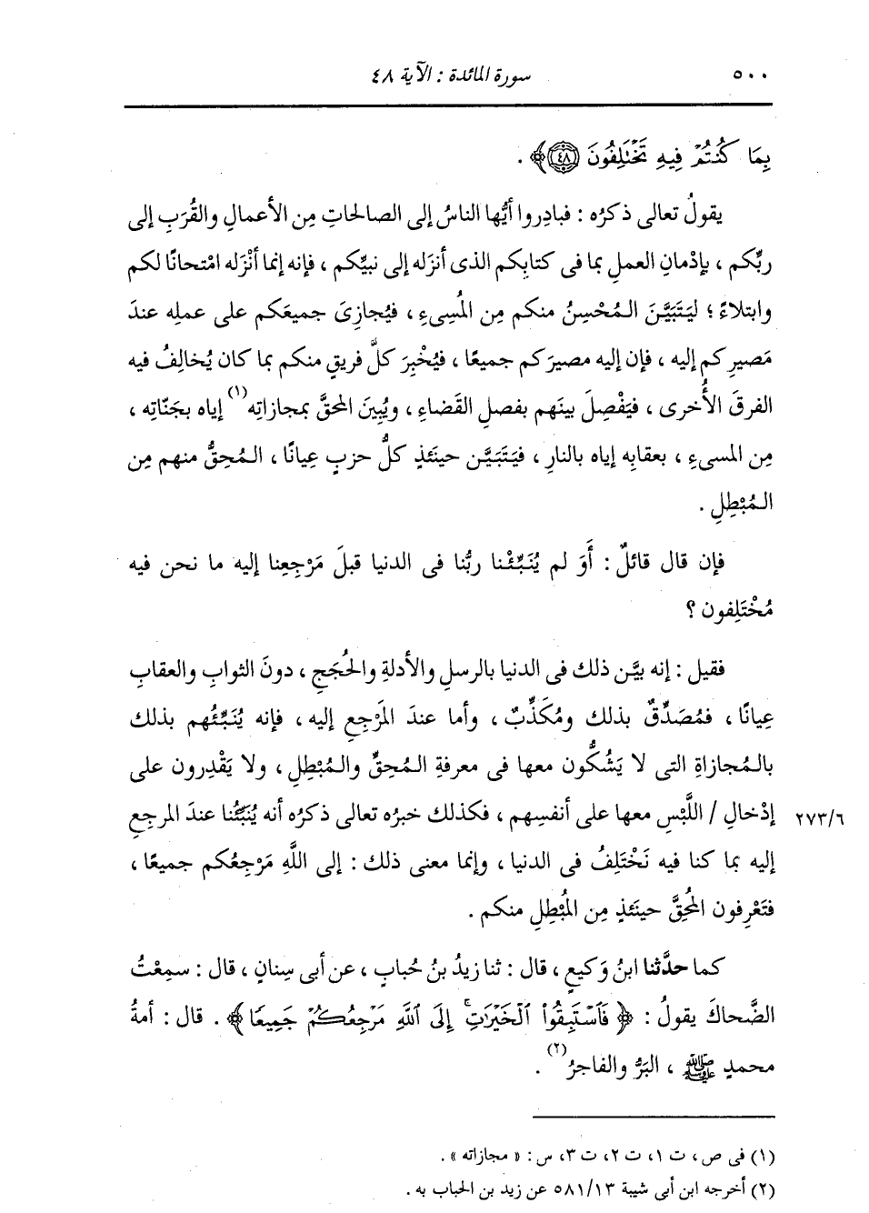 بِمَا كُنْتُمْ فِيهِ تَخْتَلِفُونَ} [المائدة: 48] يَقُولُ تَعَالَى ذِكْرُهُ: فَبَادِرُوا أَيُّهَا النَّاسُ , إِلَى الصَّالِحَاتِ مِنَ الْأَعْمَالِ وَالْقُرَبِ إِلَى رَبِّكُمْ بِإِدْمَانِ الْعَمَلِ بِمَا فِي كِتَابِكُمُ الَّذِي أَنْزَلَهُ إِلَى نَبِيِّكُمْ , فَإِنَّهُ إِنَّمَا أَنْزَلَهُ امْتِحَانًا لَكُمْ وَابْتِلَاءً , لِيَتَبَيَّنَ الْمُحْسِنَ مِنْكُمْ مِنَ الْمُسِيءِ , فَيُجَازِي جَمِيعَكُمْ عَلَى عَمَلِهِ جَزَاءَهُ عِنْدَ مَصِيرِكُمْ إِلَيْهِ , فَإِنَّ مَصِيرَكُمْ إِلَيْهِ جَمِيعًا , فَيُخْبِرُ كُلَّ فَرِيقٍ مِنْكُمْ بِمَا كَانَ يُخَالِفُ فِيهِ الْفِرَقَ الْأُخْرَى , فَيَفْصِلُ بَيْنَهُمْ بِفَصْلِ الْقَضَاءِ , وَيُبَيِّنُ الْمُحِقَّ بِمُجَازَاتِهِ إِيَّاهُ بِجَنَاتِهِ مِنَ الْمُسِيءِ بِعِقَابِهِ إِيَّاهُ بِالنَّارِ , فَيَتَبَيَّنُ حِينَئِذٍ كُلُّ حِزْبٍ عِيَانًا , الْمُحِقُّ مِنْهُمْ مِنَ الْمُبْطِلِ. فَإِنْ قَالَ قَائِلٌ: أَوَ لَمْ يُنْبِئْنَا رَبُّنَا فِي الدُّنْيَا قَبْلَ مَرْجِعِنَا إِلَيْهِ مَا نَحْنُ فِيهِ مُخْتَلِفُونَ؟ قِيلَ: إِنَّهُ بَيَّنَ ذَلِكَ فِي الدُّنْيَا بِالرُّسُلِ وَالْأَدِلَّةِ وَالْحُجَجِ , دُونَ الثَّوَابِ وَالْعِقَابِ عِيَانًا , فَمُصَدِّقٌ بِذَلِكَ وَمُكَذِّبٌ. وَأَمَّا عِنْدَ الْمَرْجِعِ إِلَيْهِ , فَإِنَّهُ يُنَبِّئُهُمْ بِذَلِكَ بِالْمُجَازَاةِ الَّتِي لَا يَشْكُونَ مَعَهَا فِي مَعْرِفَةِ الْمُحِقِّ وَالْمُبْطِلِ , وَلَا يَقْدِرُونَ عَلَى إِدْخَالِ اللَّبْسَ مَعَهَا عَلَى أَنْفُسِهِمْ , فَكَذَلِكَ خَبَرُهُ تَعَالَى ذِكْرُهُ أَنَّهُ يُنْبِئُنَا عِنْدَ الْمَرْجِعُ إِلَيْهِ بِمَا كُنَّا فِيهِ نَخْتَلِفُ فِي الدُّنْيَا. وَإِنَّمَا مَعْنَى ذَلِكَ: إِلَى اللَّهِ مَرْجِعُكُمْ جَمِيعًا , فَتَعْرِفُونَ الْمُحِقَّ حِينَئِذٍ مِنَ الْمُبْطِلِ مِنْكُمْ. كَمَا: