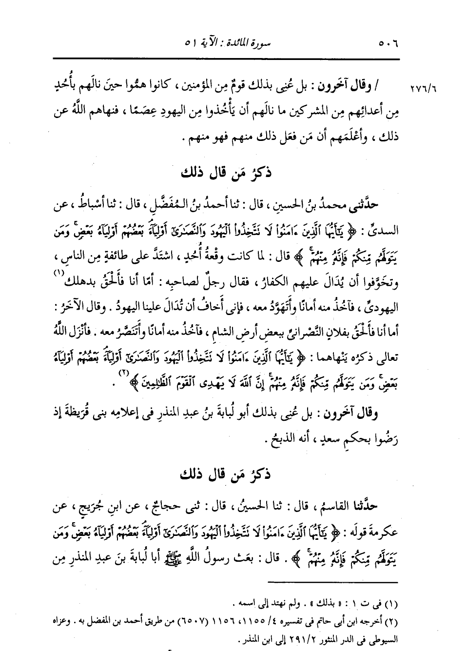 ذِكْرُ مَنْ قَالَ ذَلِكَ: حَدَّثَنِي مُحَمَّدُ بْنُ الْحُسَيْنِ , قَالَ: ثنا أَحْمَدُ بْنُ الْمُفَضَّلِ , قَالَ: ثنا أَسْبَاطٌ , عَنِ السُّدِّيِّ: {§يَا أَيُّهَا الَّذِينَ آمَنُوا لَا تَتَّخِذُوا الْيَهُودَ وَالنَّصَارَى أَوْلِيَاءَ بَعْضُهُمْ أَوْلِيَاءُ بَعْضٍ وَمَنْ يَتَوَلَّهُمْ مِنْكُمْ فَإِنَّهُ مِنْهُمْ} [المائدة: 51] قَالَ: " لَمَّا كَانَتْ وَقْعَةُ أُحُدٍ , اشْتَدَّ عَلَى طَائِفَةٍ مِنَ النَّاسِ وَتَخَوَّفُوا أَنْ يُدَالَ عَلَيْهِمُ الْكُفَّارُ , فَقَالَ رَجُلٌ لِصَاحِبِهِ: أَمَّا أَنَا فَأَلْحَقُ بِدَهْلَكَ الْيَهُودِيِّ فَآخُذُ مِنْهُ أَمَانًا وَأَتَهَوَّدُ مَعَهَ , فَإِنِّي أَخَافُ أَنْ تُدَالَ عَلَيْنَا الْيَهُودُ. وَقَالَ الْآخَرُ: أَمَّا أَنَا فَأَلْحَقُ بِفُلَانٍ النَّصْرَانِيِّ بِبَعْضِ أَرْضِ الشَّامِ فَآخُذُ مِنْهُ أَمَانًا وَأَنْتَصِرُ مَعَهَ. فَأَنْزَلَ اللَّهُ تَعَالَى ذِكْرُهُ يَنْهَاهُمَا: {يَا أَيُّهَا الَّذِينَ آمَنُوا لَا تَتَّخِذُوا الْيَهُودَ وَالنَّصَارَى أَوْلِيَاءَ بَعْضُهُمْ أَوْلِيَاءُ بَعْضٍ وَمَنْ يَتَوَلَّهُمْ مِنْكُمْ فَإِنَّهُ مِنْهُمْ إِنَّ اللَّهَ لَا يَهْدِي الْقَوْمَ الظَّالِمِينَ} [المائدة: 51] " وَقَالَ آخَرُونَ: بَلْ عُنِيَ بِذَلِكَ أَبُو لُبَابَةَ بْنُ عَبْدِ الْمُنْذِرِ فِي إِعْلَامِهِ بَنِي قُرَيْظَةَ إِذْ رَضُوا بِحُكْمِ سَعْدٍ أَنَّهُ الذَّبْحُ