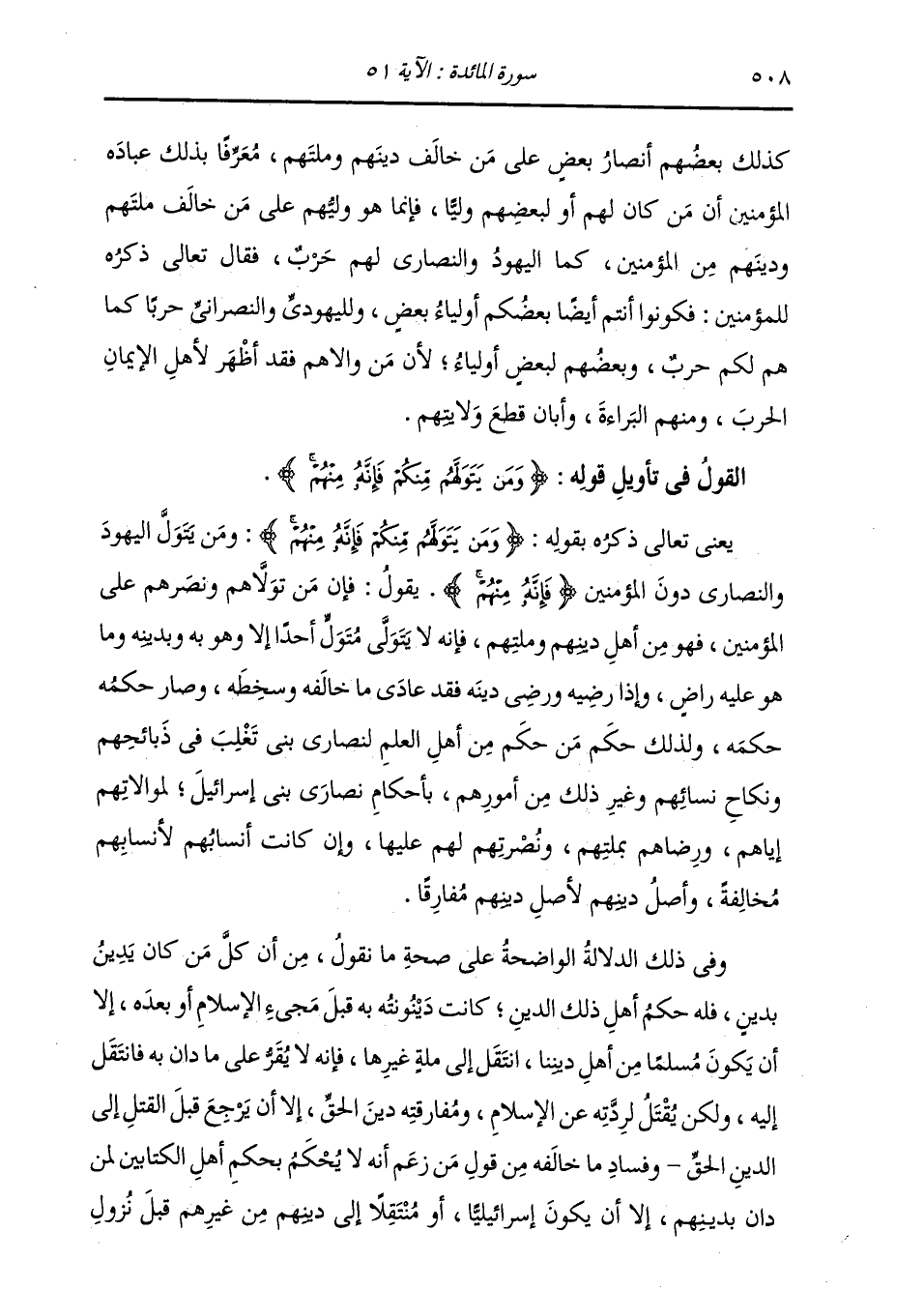 §الْقَوْلُ فِي تَأْوِيلِ قَوْلِهِ تَعَالَى: {وَمَنْ يَتَوَلَّهُمْ مِنْكُمْ فَإِنَّهُ مِنْهُمْ} [المائدة: 51] يَعْنِي تَعَالَى ذِكْرُهُ بِقَوْلِهِ: {وَمَنْ يَتَوَلَّهُمْ مِنْكُمْ فَإِنَّهُ مِنْهُمْ} [المائدة: 51] وَمَنْ يَتَوَلَّ الْيَهُودَ وَالنَّصَارَى دُونَ الْمُؤْمِنِينَ فَإِنَّهُ مِنْهُمْ , يَقُولُ: فَإِنَّ مَنْ تَوَلَّاهُمْ وَنَصَرَهُمْ عَلَى الْمُؤْمِنِينَ , فَهُوَ مِنْ أَهْلِ دِينِهِمْ وَمِلَّتِهِمْ , فَإِنَّهُ لَا يَتَوَلَّى مُتَوَلٍّ أَحَدًا إِلَّا وَهُوَ بِهِ وَبِدِينِهِ وَمَا هُوَ عَلَيْهِ رَاضٍ , وَإِذَا رَضِيَهُ وَرَضِيَ دِينَهُ فَقَدْ عَادَى مَا خَالَفَهُ وَسَخِطَهُ , وَصَارَ حُكْمُهُ حُكْمَهُ , وَلِذَلِكَ حَكَمْ مَنْ حَكَمَ مِنْ أَهْلِ الْعِلْمِ لِنَصَارَى بَنِي تَغْلِبَ فِي ذَبَائِحِهِمْ وَنِكَاحِ نِسَائِهِمْ وَغَيْرِ ذَلِكَ مِنْ أُمُورِهِمْ بِأَحْكَامِ نَصَارَى بَنِي إِسْرَائِيلَ , لِمُوَالَاتِهِمْ إِيَّاهُمْ وَرِضَاهُمْ بِمِلَّتِهِمْ وَنُصرَتِهِمْ لَهُمْ عَلَيْهَا , وَإِنْ كَانَتْ أَنْسَابُهُمْ لِأَنْسَابِهِمْ مُخَالِفَةً وَأَصْلُ دِينِهِمْ لِأَصْلِ دِينِهِمْ مُفَارِقًا. وَفِي ذَلِكَ الدَّلَالَةُ الْوَاضِحَةُ عَلَى صِحَّةِ مَا نَقُولُ , مِنْ أَنَّ كُلَّ مَنْ كَانَ يَدِينُ بِدِينٍ فَلَهُ حُكْمُ أَهْلِ ذَلِكَ الدِّينِ كَانَتْ دَيْنُونَتُهُ بِهِ قَبْلَ مَجِيءِ الْإِسْلَامِ أَوْ بَعْدَهُ , إِلَّا أَنْ يَكُونَ مُسْلِمًا مِنْ أَهْلِ دِينِنَا انْتَقَلَ إِلَى مِلَّةٍ غَيْرِهَا , فَإِنَّهُ لَا يُقَرُّ عَلَى مَا دَانَ بِهِ فَانْتَقَلَ إِلَيْهِ , وَلَكِنْ يُقْتَلُ لِرِدَّتِهِ عَنِ الْإِسْلَامِ وَمُفَارَقَتِهِ دِينَ الْحَقِّ , إِلَّا أَنْ يَرْجِعَ قَبْلَ الْقَتْلِ إِلَى الدِّينِ الْحَقِّ , وَفَسَادُ مَا خَالَفَهُ مِنْ قَوْلِ مَنْ زَعَمَ أَنَّهُ لَا يَحْكُمُ بِحُكْمِ أَهْلِ الْكِتَابَيْنِ لِمَنْ دَانَ بِدِينِهِمْ , إِلَّا أَنْ يَكُونَ إِسْرَائِيلِيًّا أَوْ مُنْتَقِلًا إِلَى دِينِهِمْ مِنْ غَيْرِهِمْ قَبْلَ نُزُولِ