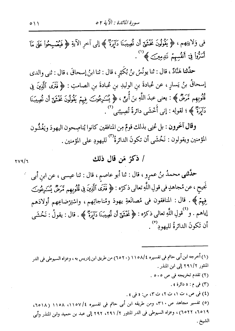 ذِكْرُ مَنْ قَالَ ذَلِكَ: حَدَّثَنِي مُحَمَّدُ بْنُ عَمْرٍو , قَالَ: ثنا أَبُو عَاصِمٍ , قَالَ: ثنا عِيسَى , عَنِ ابْنِ أَبِي نَجِيحٍ , عَنْ مُجَاهِدٍ , فِي قَوْلِ اللَّهِ تَعَالَى ذِكْرُهُ: {§فَتَرَى الَّذِينَ فِي قُلُوبِهِمْ مَرَضٌ يُسَارِعُونَ فِيهِمْ} [المائدة: 52] قَالَ: " الْمُنَافِقُونَ فِي مُصَانَعَةِ يَهُودَ وَمُنَاجَاتِهِمْ , وَاسْتِرْضَاعِهِمْ أَوْلَادَهُمْ إِيَّاهُمْ. وَقَوْلُ اللَّهِ تَعَالَى ذِكْرُهُ: {نَخْشَى أَنْ تُصِيبَنَا دَائِرَةٌ} [المائدة: 52] قَالَ: " يَقُولُ: نَخْشَى أَنْ تَكُونَ الدَّائِرَةُ لِلْيَهُودِ " -[512]- حَدَّثَنِي الْمُثَنَّى , قَالَ: ثنا أَبُو حُذَيْفَةَ , قَالَ: ثنا شِبْلٌ , عَنِ ابْنِ أَبِي نَجِيحٍ , عَنْ مُجَاهِدٍ , مِثْلَهُ