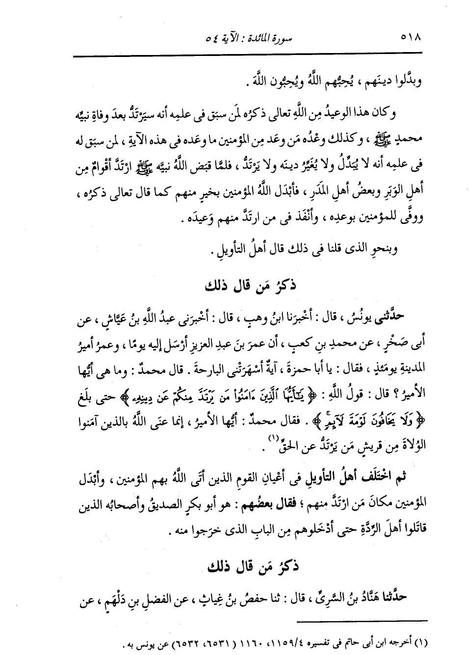 ذِكْرُ مَنْ قَالَ ذَلِكَ: حَدَّثَنِي يُونُسُ , قَالَ: أَخْبَرَنَا ابْنُ وَهْبٍ , قَالَ: أَخْبَرَنِي عَبْدُ اللَّهِ بْنُ عَيَّاشٍ , عَنْ أَبِي صَخْرٍ , عَنْ مُحَمَّدِ بْنِ كَعْبٍ: أَنَّ عُمَرَ بْنَ عَبْدِ الْعَزِيزِ , أَرْسَلَ إِلَيْهِ يَوْمًا وَعُمَرُ أَمِيرُ الْمَدِينَةِ يَوْمَئِذٍ , فَقَالَ: يَا أَبَا حَمْزَةَ , آيَةٌ أَسْهَرَتْنِي الْبَارِحَةَ. قَالَ مُحَمَّدٌ: وَمَا هِيَ أَيُّهَا الْأَمِيرُ؟ قَالَ: قَوْلُ اللَّهِ: {§يَا أَيُّهَا الَّذِينَ آمَنُوا مَنْ يَرْتَدَّ مِنْكُمْ عَنْ دِينِهِ} [المائدة: 54] حَتَّى بَلَغَ: {وَلَا يَخَافُونَ لَوْمَةَ لَائِمٍ} فَقَالَ مُحَمَّدٌ: أَيُّهَا الْأَمِيرُ , إِنَّمَا عَنَى اللَّهُ بِالَّذِينَ آمَنُوا: الْوُلَاةَ مِنْ قُرَيْشٍ , مَنْ يَرْتَدَّ عَنِ الْحَقِّ " ثُمَّ اخْتَلَفَ أَهْلُ التَّأْوِيلِ فِي أَعْيَانِ الْقَوْمِ الَّذِينَ أَتَى اللَّهُ بِهِمُ الْمُؤْمِنِينَ وَأَبْدَلَ الْمُؤْمِنِينَ مَكَانَ مَنِ ارْتَدَّ مِنْهُمْ , فَقَالَ بَعْضُهُمْ: هُوَ أَبُو بَكْرٍ الصِّدِّيقُ وَأَصْحَابُهُ الَّذِينَ قَاتَلُوا أَهْلَ الرِّدَّةِ حَتَّى أَدْخَلُوهُمْ مِنَ الْبَابِ الَّذِي خَرَجُوا مِنْهُ