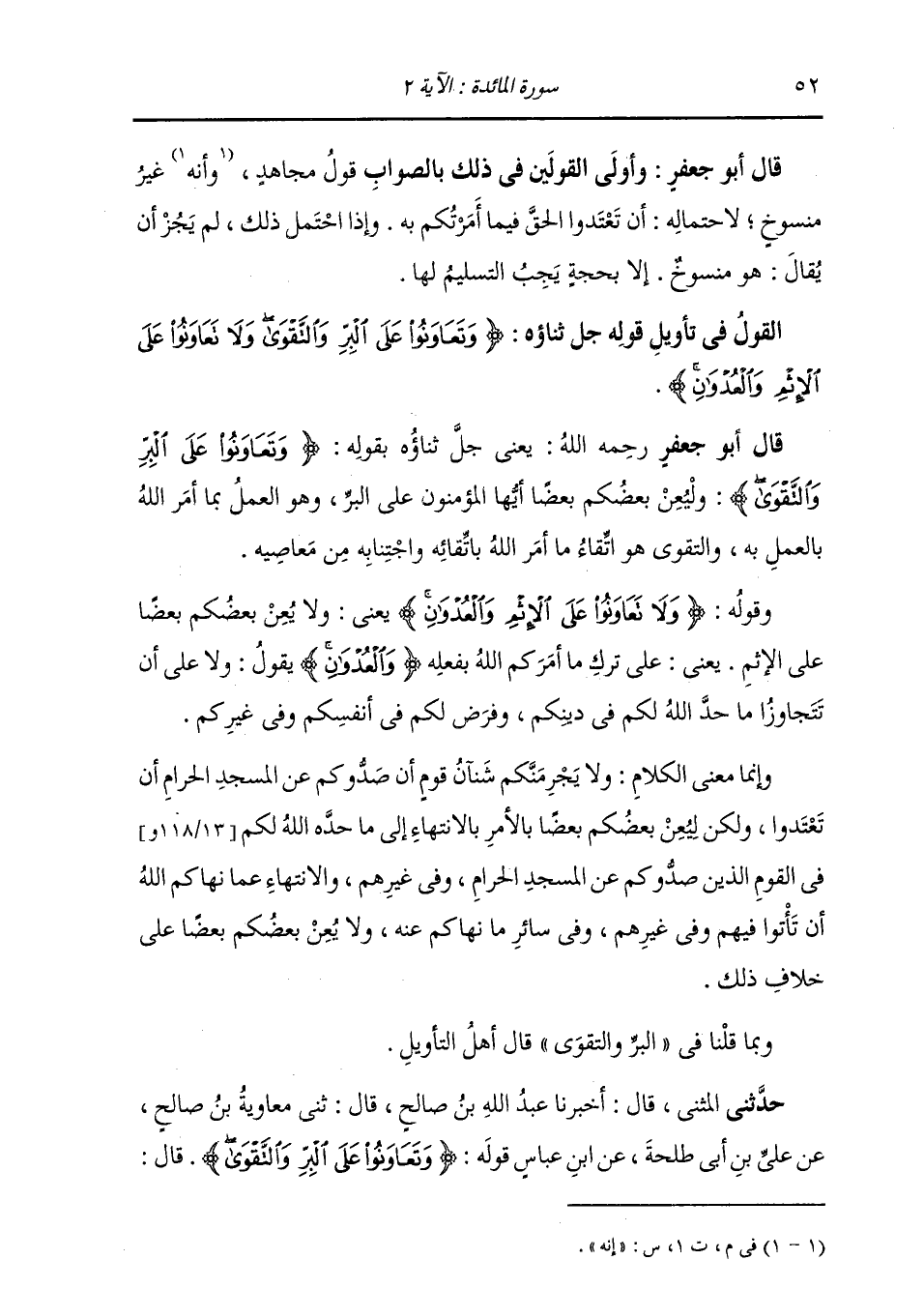 §الْقَوْلُ فِي تَأْوِيلِ قَوْلِهِ تَعَالَى: {وَتَعَاوَنُوا عَلَى الْبِرِّ وَالتَّقْوَى وَلَا تَعَاوَنُوا عَلَى الْإِثْمِ وَالْعُدْوَانِ} [المائدة: 2] يَعْنِي جَلَّ ثَنَاؤُهُ بِقَوْلِهِ: {وَتَعَاوَنُوا عَلَى الْبِرِّ وَالتَّقْوَى} [المائدة: 2] وَلْيُعِنْ بَعْضُكُمْ أَيُّهَا الْمُؤْمِنُونَ بَعْضًا عَلَى الْبِرِّ , وَهُوَ الْعَمَلُ بِمَا أَمَرَ اللَّهُ بِالْعَمَلِ بِهِ {وَالتَّقْوَى} [المائدة: 2] هُوَ اتِّقَاءُ مَا أَمَرَ اللَّهُ بِاتِّقَائِهِ وَاجْتِنَابِهِ مِنْ مَعَاصِيهِ. وَقَوْلُهُ: {وَلَا تَعَاوَنُوا عَلَى الْإِثْمِ وَالْعُدْوَانِ} [المائدة: 2] يَعْنِي: وَلَا يُعِنْ بَعْضُكُمْ بَعْضًا عَلَى الْإِثْمِ , يَعْنِي: عَلَى تَرْكَ مَا أَمَرَكُمُ اللَّهُ بِفِعْلِهِ. {وَالْعُدْوَانِ} [البقرة: 85] يَقُولُ: " وَلَا عَلَى أَنْ تَتَجَاوَزُوا مَا حَدِّ اللَّهِ لَكُمْ فِي دِينِكُمْ , وَفَرَضَ لَكُمْ فِي أَنْفُسِكُمْ وَفِي غَيْرِكُمْ. وَإِنَّمَا مَعْنَى الْكَلَامِ: وَلَا يَجْرِمَنَّكُمْ شَنَآنُ قَوْمٍ أَنْ صَدُّوكُمْ عَنِ الْمَسْجِدِ الْحَرَامِ أَنْ تَعْتَدُوا , وَلَكِنْ لِيُعِنْ بَعْضُكُمْ بَعْضًا بِالْأَمْرِ بِالِانْتِهَاءِ إِلَى مَا حَدَّهُ اللَّهُ لَكُمْ فِي الْقَوْمِ الَّذِينَ صَدُّوكُمْ عَنِ الْمَسْجِدِ الْحَرَامِ وَفِي غَيْرِهِمْ , وَالِانْتِهَاءِ عَمَّا نَهَاكُمُ اللَّهُ أَنْ تَأْتُوا فِيهِمْ وَفِي غَيْرِهِمْ وَفِي سَائِرِ مَا نَهَاكُمْ عَنْهُ , وَلَا يُعِنْ بَعْضُكُمْ بَعْضًا عَلَى خِلَافِ ذَلِكَ. وَبِمَا قُلْنَا فِي الْبِرِّ وَالتَّقْوَى قَالَ أَهْلُ التَّأْوِيلِ "