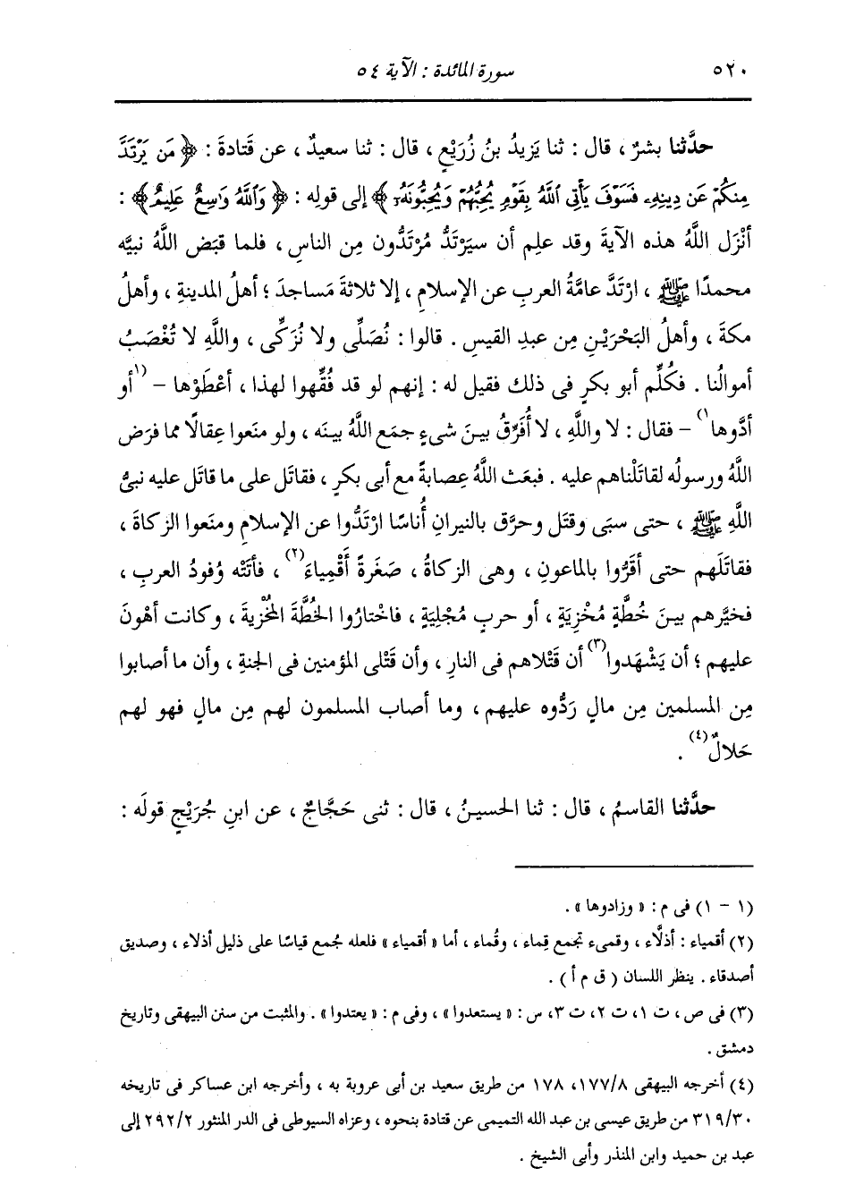 حَدَّثَنَا بِشْرٌ , قَالَ: ثنا يَزِيدُ بْنُ زُرَيْعٍ , قَالَ: ثنا سَعِيدٌ , عَنْ قَتَادَةَ: {§مَنْ يَرْتَدَّ مِنْكُمْ عَنْ دِينِهِ , فَسَوْفَ يَأْتِي اللَّهُ بِقَوْمٍ يُحِبُّهُمْ وَيُحِبُّونَهُ} [المائدة: 54] إِلَى قَوْلِهِ: {وَاللَّهُ وَاسِعٌ عَلِيمٌ} [البقرة: 247] أَنْزَلَ اللَّهُ هَذِهِ الْآيَةَ , وَقَدْ عَلِمَ أَنْ سَيَرْتَدَّ مُرْتَدُّونَ مِنَ النَّاسِ. فَلَمَّا قَبَضَ اللَّهُ نَبِيَّهُ مُحَمَّدًا صَلَّى اللهُ عَلَيْهِ وَسَلَّمَ , ارْتَدَّ عَامَّةُ الْعَرَبِ عَنِ الْإِسْلَامِ إِلَّا ثَلَاثَةِ مَسَاجِدَ: أَهْلُ الْمَدِينَةِ , وَأَهْلُ مَكَّةَ وَأَهْلُ الْبَحْرَيْنِ مِنْ عَبْدِ الْقَيْسِ قَالُوا: نُصَلِّي وَلَا نُزَكِّي , وَاللَّهِ لَا تُغْصَبُ أَمْوَالُنَا. فكُلِّمَ أَبُو بَكْرٍ فِي ذَلِكَ , فَقِيلَ لَهُ: إِنَّهُمْ لَوْ قَدْ فَقِهُوا لِهَذَا , أَعْطُوهَا وَزَادُوهَا: فَقَالَ: لَا وَاللَّهِ , لَا أُفَرِّقُ بَيْنَ شَيْءٍ جَمَعَ اللَّهُ بَيْنَهُ , وَلَوْ مَنَعُوا عِقَالَا مِمَّا فَرَضَ اللَّهُ وَرَسُولُهُ , لَقَاتَلْنَاهُمْ عَلَيْهِ. فبَعَثَ اللَّهُ عِصَابَةً مَعَ أَبِي بَكْرٍ , فَقَاتَلَ عَلَى مَا قَاتَلَ عَلَيْهِ نَبِيُّ اللَّهِ صَلَّى اللهُ عَلَيْهِ وَسَلَّمَ , حَتَّى سَبَى وَقَتَلَ وَحَرَّقَ بِالنِّيرَانِ أُنَاسًا ارْتَدُّوا عَنِ الْإِسْلَامِ وَمَنَعُوا الزَّكَاةَ , فَقَاتَلَهُمْ حَتَّى أَقَرُّوا بِالْمَاعُونِ وَهِيَ الزَّكَاةُ صَغَرَةً أَقْمِيَاءَ. فأَتَتْهُ وُفُودُ الْعَرَبِ , فَخَيَّرَهُمْ بَيْنَ خُطَّةٍ مُخْزِيَةٍ أَوْ حَرْبٍ مُجْلِيَةٍ , فَاخْتَارُوا الْخُطَّةَ الْمُخْزِيَةَ , وَكَانَتْ أَهْوَنَ عَلَيْهِمْ , أَنْ يَعْتَدُوا أَنَّ قَتْلَاهُمْ فِي النَّارِ وَأَنَّ قَتْلَى الْمُؤْمِنِينَ فِي الْجَنَّةِ , وَأَنَّ مَا أَصَابُوا مِنَ الْمُسْلِمِينَ مِنْ مَالٍ رَدُّوهُ عَلَيْهِمْ , وَمَا أَصَابَ الْمُسْلِمُونَ لَهُمْ مِنْ مَالٍ فَهُوَ لَهُمْ حَلَالٌ "