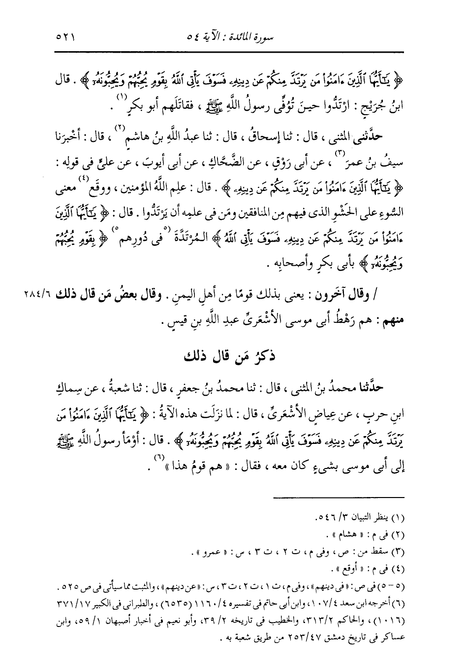 حَدَّثَنِي الْمُثَنَّى , قَالَ: ثنا إِسْحَاقُ , قَالَ: ثنا عَبْدُ اللَّهِ بْنُ هِشَامٍ , قَالَ: أَخْبَرَنَا سَيْفُ بْنُ عُمَرَ , عَنْ أَبِي رَوْقٍ , عَنِ الضَّحَّاكِ , عَنْ أَبِي أَيُّوبَ , عَنْ عَلِيٍّ فِي قَوْلِهِ: {§يَا أَيُّهَا الَّذِينَ آمَنُوا مَنْ يَرْتَدَّ مِنْكُمْ عَنْ دِينِهِ} [المائدة: 54] قَالَ: " عَلِمَ اللَّهُ الْمُؤْمِنِينَ , وَأَوْقَعَ مَعْنَى السُّوءِ عَلَى الْحَشْوِ الَّذِي فِيهِمْ مِنَ الْمُنَافِقِينَ وَمَنْ فِي عِلْمِهِ أَنْ يَرْتَدُّوا , قَالَ: {يَا أَيُّهَا الَّذِينَ آمَنُوا مَنْ يَرْتَدَّ مِنْكُمْ عَنْ دِينِهِ فَسَوْفَ يَأْتِي اللَّهُ} [المائدة: 54] الْمُرْتَدَّةُ عَنْ دِينِهِمْ بِقَوْمٍ يُحِبُّهُمْ وَيُحِبُّونَهُ بِأَبِي بَكْرٍ وَأَصْحَابِهِ " وَقَالَ آخَرُونَ: يَعْنِي بِذَلِكَ قَوْمًا مِنْ أَهْلِ الْيَمَنِ. وَقَالَ بَعْضُ مَنْ قَالَ ذَلِكَ مِنْهُمْ: هُمْ رَهْطُ أَبِي مُوسَى الْأَشْعَرِيِّ: عَبْدِ اللَّهِ بْنِ قَيْسٍ