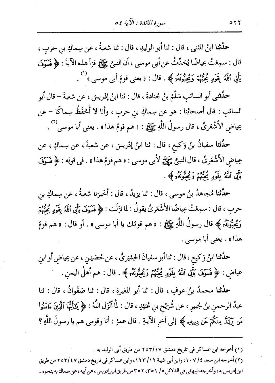 حَدَّثَنَا مُحَمَّدُ بْنُ عَوْفٍ , قَالَ: ثنا أَبُو الْمُغِيرَةِ , قَالَ: ثنا صَفْوَانُ , قَالَ: ثنا عَبْدُ الرَّحْمَنِ بْنُ جُبَيْرٍ , عَنْ شُرَيْحِ بْنِ عُبَيْدٍ , قَالَ: لَمَّا أَنْزَلَ اللَّهُ: {§يَا أَيُّهَا الَّذِينَ آمَنُوا مَنْ يَرْتَدَّ مِنْكُمْ عَنْ دِينِهِ} [المائدة: 54] إِلَى آخِرِ الْآيَةِ , قَالَ عُمَرُ: أَنَا وَقَوْمِي هُمْ يَا رَسُولَ اللَّهِ؟ -[523]- قَالَ: «لَا بَلْ هَذَا وَقَوْمُهُ» يَعْنِي أَبَا مُوسَى الْأَشْعَرِيَّ " وَقَالَ آخَرُونَ مِنْهُمْ: بَلْ هُمْ أَهْلُ الْيَمَنِ جَمِيعًا