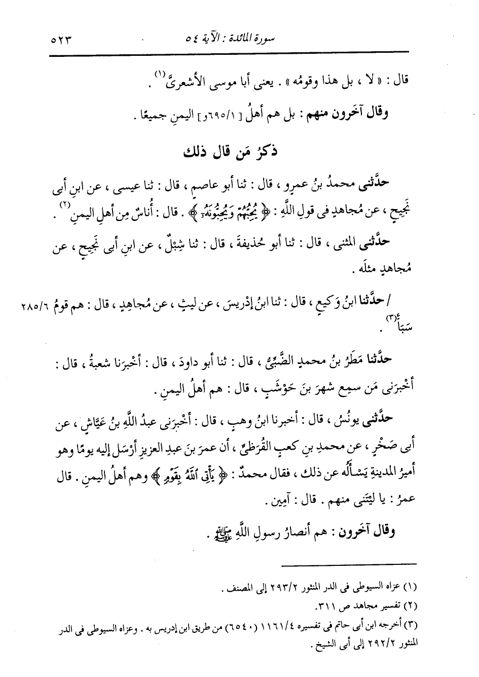 ذِكْرُ مَنْ قَالَ ذَلِكَ: حَدَّثَنِي مُحَمَّدُ بْنُ عَمْرٍو , قَالَ: ثنا أَبُو عَاصِمٍ , قَالَ: ثنا عِيسَى , عَنِ ابْنِ أَبِي نَجِيحٍ , عَنْ مُجَاهِدٍ , فِي قَوْلِ اللَّهِ: {§يُحِبُّهُمْ وَيُحِبُّونَهُ} [المائدة: 54] قَالَ: «أُنَاسٌ مِنْ أَهْلِ الْيَمَنِ» حَدَّثَنِي الْمُثَنَّى , قَالَ: ثنا أَبُو حُذَيْفَةَ , قَالَ: ثنا شِبْلٌ , عَنِ ابْنِ أَبِي نَجِيحٍ , عَنْ مُجَاهِدٍ , مِثْلَهُ
