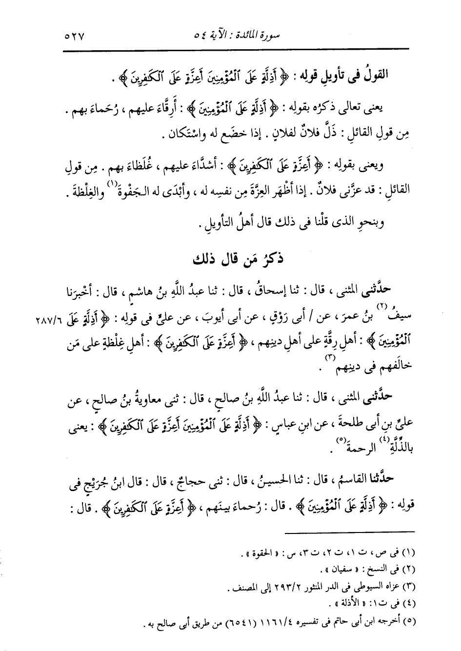 حَدَّثَنِي الْمُثَنَّى , قَالَ: ثنا عَبْدُ اللَّهِ بْنُ صَالِحٍ , قَالَ: ثني مُعَاوِيَةُ بْنُ صَالِحٍ , عَنْ عَلِيِّ بْنِ أَبِي طَلْحَةَ , عَنِ ابْنِ عَبَّاسٍ: {§أَذِلَّةٍ عَلَى الْمُؤْمِنِينَ أَعِزَّةٍ عَلَى الْكَافِرِينَ} [المائدة: 54] يَعْنِي بِالذِّلَّةِ: الرَّحْمَةَ "