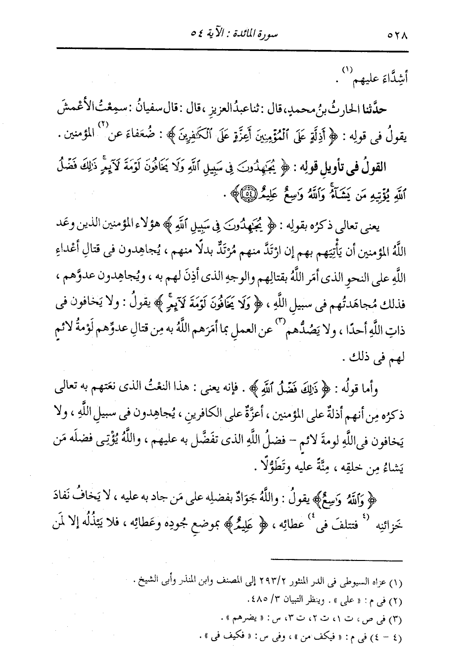 §الْقَوْلُ فِي تَأْوِيلِ قَوْلِهِ تَعَالَى: يُجَاهِدُونَ فِي سَبِيلِ اللَّهِ وَلَا يَخَافُونَ لَوْمَةَ لَائِمٍ ذَلِكَ فَضْلُ اللَّهِ يُؤْتِيهِ مَنْ يَشَاءُ وَاللَّهُ وَاسِعٌ عَلِيمٌ يَعْنِي تَعَالَى ذِكْرُهُ بِقَوْلِهِ: يُجَاهِدُونَ فِي سَبِيلِ اللَّهِ هَؤُلَاءِ الْمُؤْمِنِينَ الَّذِينَ وَعَدَ اللَّهُ الْمُؤْمِنِينَ أَنْ يَأْتِيَهُمْ بِهِمْ إِنِ ارْتَدَّ مِنْهُمْ مُرْتَدٌّ بَدَلًا مِنْهُمْ , يُجَاهِدُونَ فِي قِتَالِ أَعْدَاءِ اللَّهِ , عَلَى النَّحْوِ الَّذِي أَمَرَ اللَّهُ بِقِتَالِهِمْ وَالْوَجْهِ الَّذِي أَذِنَ لَهُمْ بِهِ , وَيُجَاهِدُونَ عَدُوَّهُمْ , فَذَلِكَ مُجَاهَدَتُهُمْ فِي سَبِيلِ اللَّهِ وَلَا يَخَافُونَ لَوْمَةَ لَائِمٍ يَقُولُ: " وَلَا يَخَافُونَ فِي ذَاتِ اللَّهِ أَحَدًا , وَلَا يَصُدُّهُمْ عَنِ الْعَمَلِ بِمَا أَمَرَهُمُ اللَّهُ بِهِ مِنْ قِتَالِ عَدُوِّهِمْ لَوْمَةَ لَائِمٍ لَهُمْ فِي ذَلِكَ. وَأَمَّا قَوْلُهُ: ذَلِكَ فَضْلُ اللَّهِ فَإِنَّهُ يَعْنِي: هَذَا النَّعْتَ الَّذِي نَعَتَهُمْ بِهِ تَعَالَى ذِكْرُهُ مِنْ أَنَّهُمْ أَذِلَّةٌ عَلَى الْمُؤْمِنِينَ , أَعِزَّةٌ عَلَى الْكَافِرِينَ , يُجَاهِدُونَ فِي سَبِيلِ اللَّهِ , وَلَا يَخَافُونَ فِي اللَّهِ لَوْمَةَ لَائِمٍ , فَضْلُ اللَّهِ الَّذِي تَفَضَّلَ بِهِ عَلَيْهِمْ , وَاللَّهُ يُؤْتِي فَضْلَهُ مَنْ يَشَاءُ مِنْ خَلْقِهِ , مِنَّةً عَلَيْهِ وَتَطَوُّلًا وَاللَّهُ وَاسِعٌ يَقُولُ: " وَاللَّهُ جَوَادٌ بِفَضْلِهِ عَلَى مَنْ جَادَ بِهِ عَلَيْهِ , لَا يَخَافُ نَفَادَ خَزَائِنِهِ فَيَكُفَّ مِنْ عَطَائِهِ عَلِيمٌ بِمَوْضِعِ جُودِهِ وَعَطَائِهِ , فَلَا يَبْذُلُهُ إِلَّا لِمَنِ