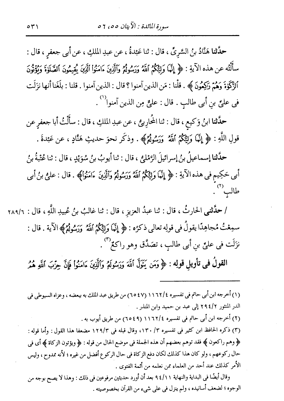 حَدَّثَنَا هَنَّادُ بْنُ السَّرِيِّ , قَالَ ثَنَا عَبْدَةَ: عَنْ عَبْدِ الْمَلِكِ , عَنْ أَبِي جَعْفَرٍ , قَالَ: سَأَلْتُهُ عَنْ هَذِهِ الْآيَةِ: {§إِنَّمَا وَلِيُّكُمُ اللَّهُ وَرَسُولُهُ وَالَّذِينَ آمَنُوا الَّذِينَ يُقِيمُونَ الصَّلَاةَ وَيُؤْتُونَ الزَّكَاةَ وَهُمْ رَاكِعُونَ} [المائدة: 55] قُلْنَا: مَنِ الَّذِينَ آمَنُوا؟ قَالَ: الَّذِينَ آمَنُوا. قلْنَا: بَلَغَنَا أَنَّهَا نَزَلَتْ فِي عَلِيِّ بْنِ أَبِي طَالِبٍ , قَالَ: عَلِيٌّ مِنَ الَّذِينَ آمَنُوا "