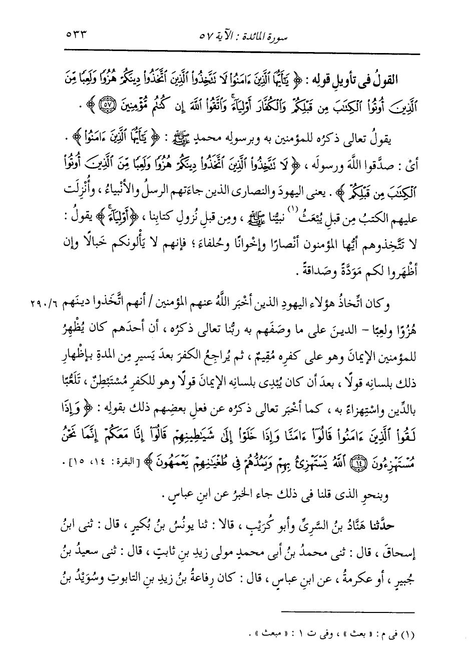§الْقَوْلُ فِي تَأْوِيلِ قَوْلِهِ تَعَالَى: {يَا أَيُّهَا الَّذِينَ آمَنُوا لَا تَتَّخِذُوا الَّذِينَ اتَّخَذُوا دِينَكُمْ هُزُوًا وَلَعِبًا مِنَ الَّذِينَ أُوتُوا الْكِتَابَ مِنْ قَبْلِكُمْ وَالْكُفَّارَ أَوْلِيَاءَ وَاتَّقُوا اللَّهَ إِنْ كُنْتُمْ مُؤْمِنِينَ} [المائدة: 57] يَقُولُ تَعَالَى ذِكْرُهُ لِلْمُؤْمِنِينَ بِهِ وَبِرَسُولِهِ مُحَمَّدٍ صَلَّى اللهُ عَلَيْهِ وَسَلَّمَ: {يَا أَيُّهَا الَّذِينَ آمَنُوا} [البقرة: 104] أَيْ " صَدَّقُوا اللَّهَ وَرَسُولَهُ {لَا تَتَّخِذُوا الَّذِينَ اتَّخَذُوا دِينَكُمْ هُزُوًا وَلَعِبًا مِنَ الَّذِينَ أُوتُوا الْكِتَابَ مِنْ قَبْلِكُمْ} [المائدة: 57] يَعْنِي الْيَهُودَ وَالنَّصَارَى الَّذِينَ جَاءَتْهُمُ الرُّسُلُ وَالْأَنْبِيَاءُ , وَأُنْزِلَتْ عَلَيْهِمُ الْكُتُبُ مِنْ قَبْلِ بَعْثِ نَبِيِّنَا صَلَّى اللهُ عَلَيْهِ وَسَلَّمَ وَمِنْ قَبْلِ نُزُولِ كِتَابِنَا أَوْلِيَاءَ. يَقُولُ: لَا تَتَّخِذُوهُمْ أَيُّهَا الْمُؤْمِنُونَ أَنْصَارًا وَإِخْوَانًا وَحُلَفَاءَ , فَإِنَّهُمْ لَا يَأْلُونَكُمْ خَبَالًا وَإِنْ أَظْهَرُوا لَكُمْ مَوَدَّةً وَصَدَاقَةً. وَكَانَ اتِّخَاذُ هَؤُلَاءِ الْيَهُودِ الَّذِينَ أَخْبَرَ اللَّهُ عَنْهُمُ الْمُؤْمِنِينَ أَنَّهُمُ اتَّخَذُوا دِينَهُمْ هُزُوًا وَلَعِبًا الدِّينَ عَلَى مَا وَصَفَهُمْ بِهِ رَبُّنَا تَعَالَى ذِكْرُهُ , أَنَّ أَحَدَهُمْ كَانَ يُظْهِرُ لِلْمُؤْمِنِينَ الْإِيمَانَ وَهُوَ عَلَى كُفْرِهِ مُقِيمٌ , ثُمَّ يُرَاجِعُ الْكُفْرَ بَعْدَ يَسِيرٍ مِنَ الْمُدَّةِ بِإِظْهَارِ ذَلِكَ بِلِسَانِهِ قَوْلًا بَعْدَ أَنْ كَانَ يُبْدِي بِلِسَانِهِ الْإِيمَانَ قَوْلًا وَهُوَ لِلْكُفْرِ مُسْتَبْطِنٌ , تَلَعُّبًا بِالدِّينِ وَاسْتِهْزَاءً بِهِ , كَمَا أَخْبَرَ تَعَالَى ذِكْرُهُ عَنْ فِعْلِ بَعْضِهِمْ ذَلِكَ بِقَوْلِهِ: {وَإِذَا لَقُوا الَّذِينَ آمَنُوا قَالُوا آمَنَّا وَإِذَا خَلَوْا إِلَى شَيَاطِينِهِمْ قَالُوا إِنَّا مَعَكُمْ إِنَّمَا نَحْنُ مُسْتَهْزِئُونَ اللَّهُ يَسْتَهْزِئُ بِهِمْ وَيَمُدُّهُمْ فِي طُغْيَانِهِمْ يَعْمَهُونَ} وَبِنَحْوِ الَّذِي قُلْنَا فِي ذَلِكَ جَاءَ الْخَبَرُ عَنِ ابْنِ عَبَّاسٍ