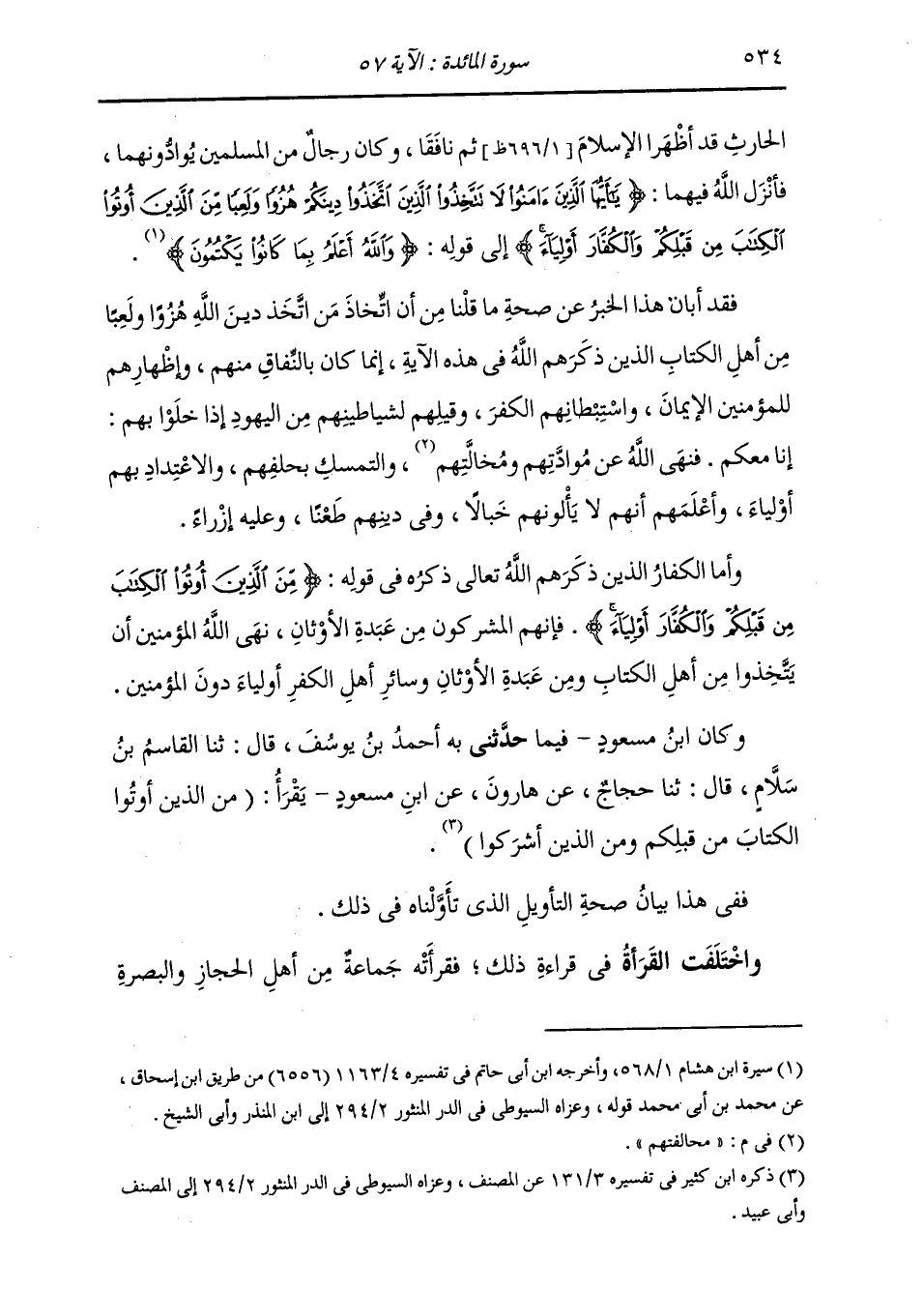 الْحَارِثِ قَدْ أَظْهَرَا الْإِسْلَامَ , ثُمَّ نَافَقَا , وَكَانَ رِجَالٌ مِنَ الْمُسْلِمِينَ يُوَادُّونَهُمَا , فَأَنْزَلَ اللَّهُ فِيهِمَا: {§يَا أَيُّهَا الَّذِينَ آمَنُوا لَا تَتَّخِذُوا الَّذِينَ اتَّخَذُوا دِينَكُمْ هُزُوًا وَلَعِبًا مِنَ الَّذِينَ أُوتُوا الْكِتَابَ مِنْ قَبْلِكُمْ وَالْكُفَّارَ أَوْلِيَاءَ} [المائدة: 57] إِلَى قَوْلِهِ: {وَاللَّهُ أَعْلَمُ بِمَا كَانُوا يَكْتُمُونَ} [المائدة: 61] " فَقَدْ أَبَانَ هَذَا الْخَبَرُ عَنْ صِحَّةِ مَا قُلْنَا مِنْ أَنَّ اتِّخَاذَ مَنِ اتَّخَذَ دِينَ اللَّهِ هُزُوًا وَلَعِبًا مِنْ أَهْلِ الْكِتَابِ الَّذِينَ ذَكَرَهُمُ اللَّهُ فِي هَذِهِ الْآيَةِ , إِنَّمَا كَانَ بِالنِّفَاقِ مِنْهُمْ وَإِظْهَارِهِمْ لِلْمُؤْمِنِينَ الْإِيمَانَ وَاسْتِبْطَانِهِمُ الْكُفْرَ وَقِيلِهِمْ لِشَيَاطِينِهِمْ مِنَ الْيَهُودِ إِذَا خَلَوْا بِهِمْ: إِنَّا مَعَكُمْ. فنَهَى اللَّهُ عَنْ مُوادَّتِهِمْ وَمُحَالَفَتِهِمْ , وَالتَّمَسُّكِ بِحِلْفِهِمْ وَالِاعْتِدَادِ بِهِمْ أَوْلِيَاءَ , وَأَعْلَمَهُمْ أَنَّهُمْ لَا يَأْلُونَهُمْ خَبَالًا , وَفِي دِينِهِمْ طَعْنًا وَعَلَيْهِ إِزْرَاءً. وَأَمَّا الْكُفَّارُ الَّذِينَ ذَكَرَهُمُ اللَّهُ تَعَالَى ذِكْرُهُ فِي قَوْلِهِ: {مِنَ الَّذِينَ أُوتُوا الْكِتَابَ مِنْ قَبْلِكُمْ وَالْكُفَّارَ أَوْلِيَاءَ} [المائدة: 57] فَإِنَّهُمُ الْمُشْرِكُونَ مِنْ عَبَدَةِ الْأَوْثَانِ نَهَى اللَّهُ الْمُؤْمِنِينَ أَنْ يَتَّخِذُوا مِنْ أَهْلِ الْكِتَابِ وَمِنْ عَبَدَةِ الْأَوْثَانِ وَسَائِرِ أَهْلِ الْكُفْرِ أَوْلِيَاءَ دُونَ الْمُؤْمِنِينَ