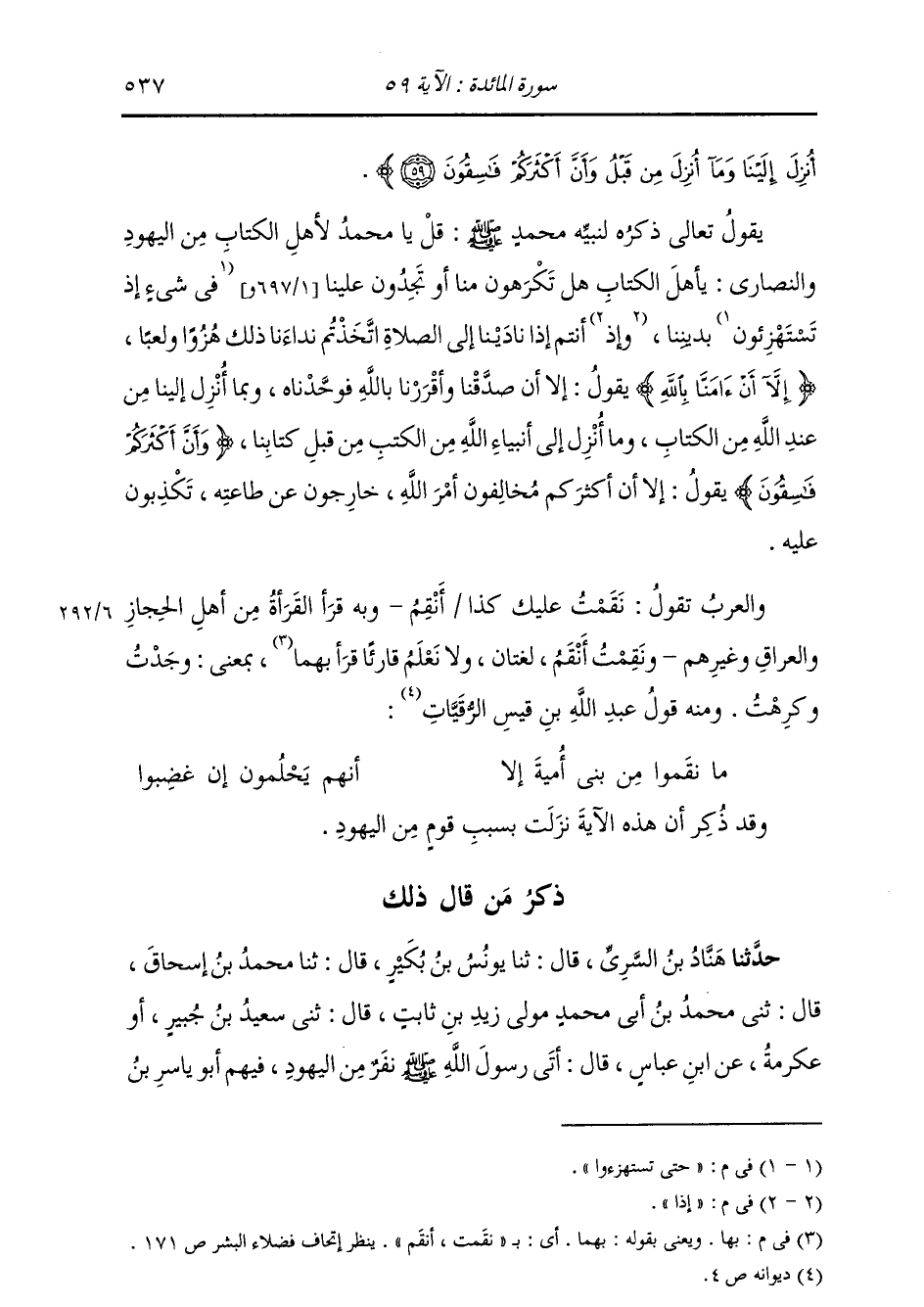 أُنْزِلَ إِلَيْنَا وَمَا أُنْزِلَ مِنْ قَبْلُ وَأَنَّ أَكْثَرَكُمْ فَاسِقُونَ} [المائدة: 59] يَقُولُ تَعَالَى ذِكْرُهُ لِنَبِيِّهِ صَلَّى اللهُ عَلَيْهِ وَسَلَّمَ: قُلْ يَا مُحَمَّدُ لَأَهْلِ الْكِتَابِ مِنَ الْيَهُودِ وَالنَّصَارَى: يَا أَهْلَ الْكِتَابِ , هَلْ تَكْرَهُونَ مِنَّا أَوْ تَجِدُونَ عَلَيْنَا حَتَّى تَسْتَهْزِئُوا بِدِينِنَا إِذَا أَنْتُمْ إِذَا نَادَيْنَا إِلَى الصَّلَاةِ اتَّخَذْتُمْ نِدَاءَنَا ذَلِكَ هُزُوًا وَلَعِبًا {إِلَّا أَنْ آمَنَّا بِاللَّهِ} [المائدة: 59] يَقُولُ: " إِلَّا أَنْ صَدَّقْنَا وَأَقْرَرْنَا بِاللَّهِ فَوَحَّدْنَاهُ , وَبِمَا أُنْزِلَ إِلَيْنَا مِنْ عِنْدِ اللَّهِ مِنَ الْكِتَابِ , وَمَا أُنْزِلَ إِلَى أَنْبِيَاءِ اللَّهِ مِنَ الْكُتُبِ مِنْ قَبْلِ كِتَابِنَا. {وَأَنَّ أَكْثَرَكُمْ فَاسِقُونَ} [المائدة: 59] يَقُولُ: " إِلَّا أَنَّ أَكْثَرَكُمْ مُخَالِفُونَ أَمْرَ اللَّهِ , خَارِجُونَ عَنْ طَاعَتِهِ , تَكْذِبُونَ عَلَيْهِ. وَالْعَرَبُ تَقُولُ: نَقَمْتُ عَلَيْكَ كَذَا أَنْقِمُ وَبِهِ قَرَأَ الْقُرَّاءَ مِنْ أَهْلِ الْحِجَازِ وَالْعِرَاقِ وَغَيْرِهِمْ وَنَقِمْتُ أَنْقَمُ لُغَتَانِ , وَلَا نَعْلَمُ قَارِئًا قَرَأَ بِهَا بِمَعْنَى وَجَدْتُ وَكَرِهْتُ , وَمِنْهُ قَوْلُ عَبْدِ اللَّهِ بْنِ قَيْسِ الرُّقَيَّاتِ: