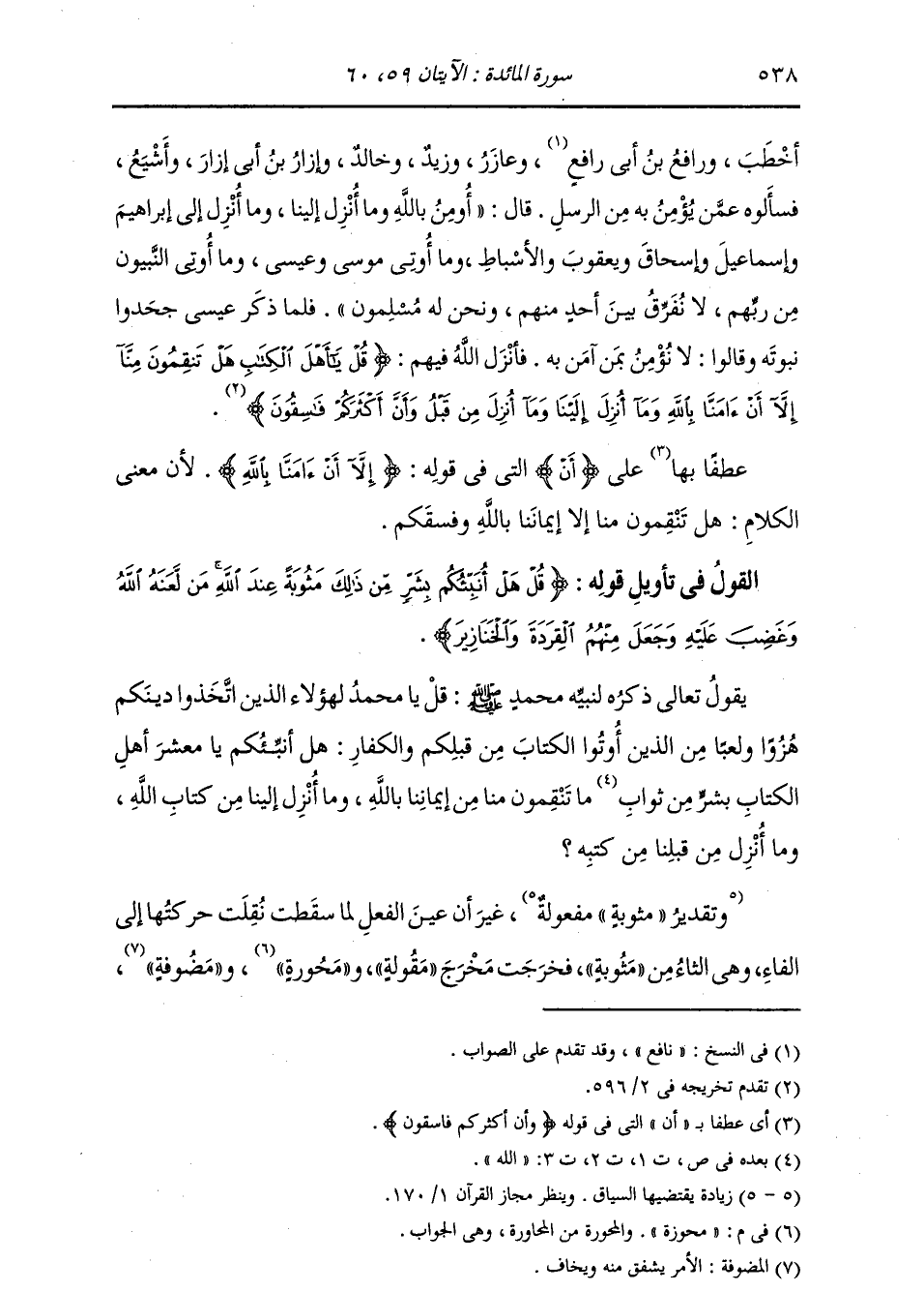 §الْقَوْلُ فِي تَأْوِيلِ قَوْلِهِ تَعَالَى: {قُلْ هَلْ أُنَبِّئُكُمْ بِشَرٍّ مِنْ ذَلِكَ مَثُوبَةً عِنْدَ اللَّهِ مَنْ لَعَنَهُ اللَّهُ وَغَضِبَ عَلَيْهِ وَجَعَلَ مِنْهُمُ الْقِرَدَةَ وَالْخَنَازِيرَ وَعَبَدَ الطَّاغُوتَ أُولَئِكَ شَرٌّ مَّكَانًا وَأَضَلُّ عَنْ سَوَاءِ السَّبِيلِ} [المائدة: 60] يَقُولُ تَعَالَى ذِكْرُهُ لِنَبِيِّهِ مُحَمَّدٍ صَلَّى اللهُ عَلَيْهِ وَسَلَّمَ: قُلْ يَا مُحَمَّدُ لِهَؤُلَاءِ الَّذِينَ اتَّخَذُوا دِينَكُمْ هُزُوًا وَلَعِبًا مِنَ الَّذِينَ أُوتُوا الْكِتَابَ مِنْ قَبْلِكُمْ وَالْكُفَّارَ: هَلْ أُنَبِّئُكُمْ يَا مَعْشَرَ أَهْلِ الْكِتَابِ بِشَرٍّ مِنْ ثَوَابِ مَا تَنْقِمُونَ مِنَّا مِنْ إِيمَانِنَا بِاللَّهِ , وَمَا أُنْزِلَ إِلَيْنَا مِنْ كِتَابِ اللَّهِ , وَمَا أُنْزِلَ مِنْ قَبْلِنَا مِنْ كُتُبِهِ؟ غَيْرَ أَنَّ الْعَيْنَ لَمَّا سُكِّنَتْ , نُقِلَتْ حَرَكَتُهَا إِلَى الْفَاءِ , وَهِيَ الثَّاءُ مِنْ مَثُوبَةً , فَخَرَجَتْ مَخْرَجَ مَقُولَةٍ , وَمَحُورَةٍ , وَمَضُوفَةٍ ,