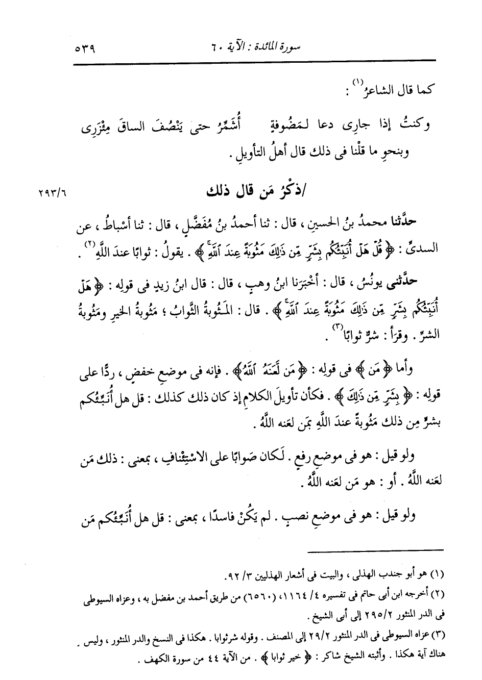 حَدَّثَنِي يُونُسُ , قَالَ: أَخْبَرَنَا ابْنُ وَهْبٍ , قَالَ: قَالَ ابْنُ زَيْدٍ فِي قَوْلِهِ: {§هَلْ أُنَبِّئُكُمْ بِشَرٍّ مِنْ ذَلِكَ مَثُوبَةً عِنْدَ اللَّهِ} [المائدة: 60] قَالَ: " الْمَثُوبَةُ: الثَّوَابُ , مَثُوبَةُ الْخَيْرِ وَمَثُوبَةُ الشَّرِّ , وَقَرَأَ: «شَرٌّ ثَوَابًا» وَأَمَّا مَنْ فِي قَوْلِهِ: {مَنْ لَعَنَهُ اللَّهُ} [المائدة: 60] فَإِنَّهُ فِي مَوْضِعِ خَفْضٍ رَدًّا عَلَى قَوْلِهِ: {بِشَرٍّ مِنْ ذَلِكَ} [المائدة: 60] فَكَأَنَّ تَأْوِيلَ الْكَلَامِ إِذْ كَانَ ذَلِكَ كَذَلِكَ: قُلْ هَلْ أُنَبِّئُكُمْ بِشَرٍّ مِنْ ذَلِكَ مَثُوبَةً عِنْدَ اللَّهِ بِمَنْ لَعَنَهُ اللَّهُ. وَلَوْ قِيلَ هُوَ فِي مَوْضِعِ رَفْعٍ لَكَانَ صَوَابًا عَلَى الِاسْتِئْنَافِ , بِمَعْنَى: ذَلِكَ مَنْ لَعَنَهُ اللَّهُ , أَوْ هُوَ مَنْ لَعَنَهُ اللَّهُ. وَلَوْ قِيلَ هُوَ فِي مَوْضِعِ نَصْبٍ لَمْ يَكُنْ فَاسِدًا , بِمَعْنَى: قُلْ هَلْ أُنَبِّئُكُمْ مَنْ