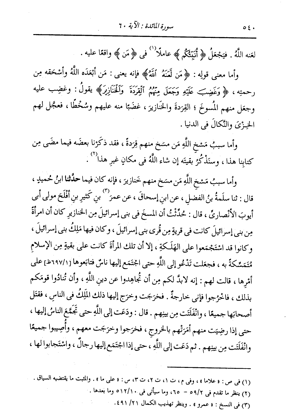 لَعَنَهُ اللَّهُ , فَيَجْعَلُ أُنَبِّئُكُمْ عَلَى مَا فِي مِنْ وَاقِعًا عَلَيْهِ. وَأَمَّا مَعْنَى قَوْلِهِ: {مَنْ لَعَنَهُ اللَّهُ} [المائدة: 60] فَإِنَّهُ يَعْنِي: مَنْ أَبْعَدَهُ اللَّهُ وَأَسْحَقَهُ مِنْ رَحْمَتِهِ وَغَضِبَ عَلَيْهِ. {وَجَعَلَ مِنْهُمُ الْقِرَدَةَ وَالْخَنَازِيرَ} [المائدة: 60] يَقُولُ: " وَغَضِبَ عَلَيْهِ , وَجَعَلَ مِنْهُمُ الْمُسُوخَ الْقِرَدَةَ وَالْخَنَازِيرَ , غَضَبًا مِنْهُ عَلَيْهِمْ وَسَخَطًا , فَعَجَّلَ لَهُمُ الْخِزْيَ وَالنَّكَالَ فِي الدُّنْيَا. وَأَمَّا سَبَبُ مَسْخِ اللَّهِ مَنْ مَسَخَ مِنْهُمْ قِرَدَةً فَقَدْ ذَكَرْنَا بَعْضَهُ فِيمَا مَضَى مِنْ كِتَابِنَا هَذَا , وَسَنَذْكُرُ بَقِيَّتَهُ إِنْ شَاءَ اللَّهُ فِي مَكَانٍ غَيْرِ هَذَا. وَأَمَّا سَبَبُ مَسْخِ اللَّهِ مَنْ مَسَخَ مِنْهُمْ خَنَازِيرَ , فَإِنَّهُ كَانَ فِيمَا: