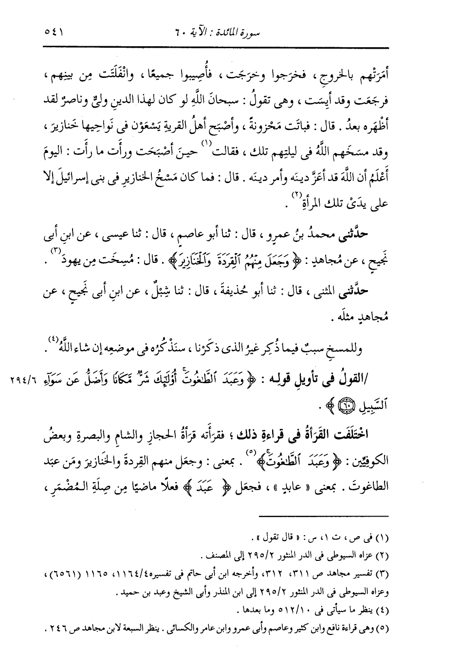 حَدَّثَنِي مُحَمَّدُ بْنُ عَمْرٍو , قَالَ: ثنا أَبُو عَاصِمٍ , قَالَ: ثنا عِيسَى , عَنِ ابْنِ أَبِي نَجِيحٍ , عَنْ مُجَاهِدٍ , فِي قَوْلِهِ: {§وَجَعَلَ مِنْهُمُ الْقِرَدَةَ وَالْخَنَازِيرَ} [المائدة: 60] قَالَ: «مُسِخَتْ مِنْ يَهُودَ» حَدَّثَنِي الْمُثَنَّى , قَالَ: ثنا أَبُو حُذَيْفَةَ , قَالَ: ثنا شِبْلٌ , عَنِ ابْنِ أَبِي نَجِيحٍ , عَنْ مُجَاهِدٍ , مِثْلَهُ وَلِلْمَسْخِ سَبَبٌ فِيمَا ذَكَرَ غَيْرُ الَّذِي ذَكَرْنَاهُ سَنَذْكُرُهُ فِي مَوْضِعِهِ إِنْ شَاءَ اللَّهُ