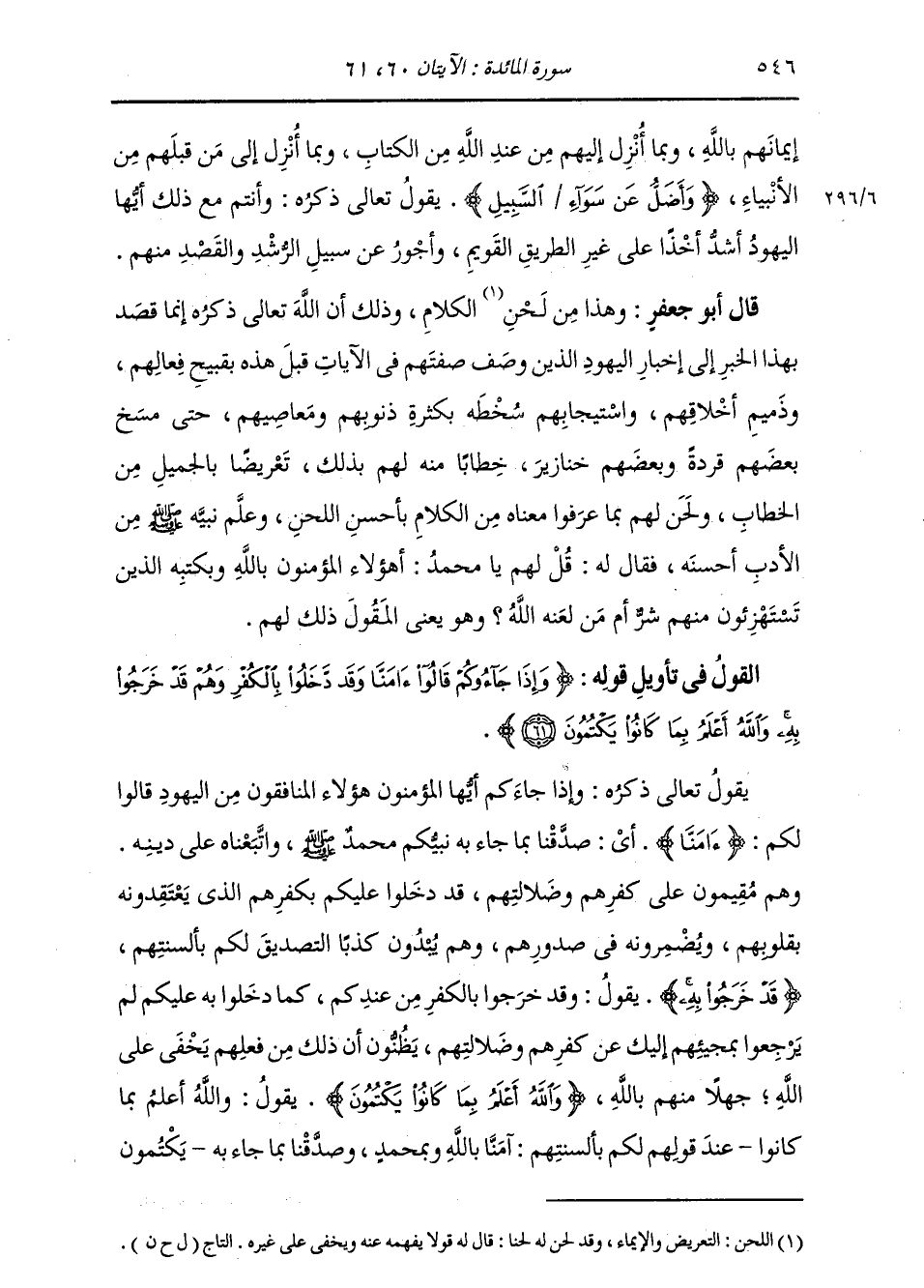 إِيمَانَهُمْ بِاللَّهِ وَبِمَا أَنْزَلَ إِلَيْهِمْ مِنْ عِنْدِ اللَّهِ مِنَ الْكِتَابِ وَبِمَا أَنْزَلَ إِلَى مَنْ قَبْلَهُمْ مِنَ الْأَنْبِيَاءِ {وَأَضَلُّ عَنْ سَوَاءِ السَّبِيلِ} [المائدة: 60] يَقُولُ تَعَالَى ذِكْرُهُ: وَأَنْتُمْ مَعَ ذَلِكَ أَيُّهَا الْيَهُودُ , أَشَدُّ أَخْذًا عَلَى غَيْرِ الطَّرِيقِ الْقَوِيمِ , وَأَجْوَرُ عَنْ سَبِيلِ الرُّشْدِ وَالْقَصْدِ مِنْهُمْ. وَهَذَا مِنْ لَحْنِ الْكَلَامِ , وَذَلِكَ أَنَّ اللَّهَ تَعَالَى ذِكْرُهُ إِنَّمَا قَصَدَ بِهَذَا الْخَبَرِ إِخْبَارَ الْيَهُودِ الَّذِينَ وَصَفَ صِفَتَهُمْ فِي الْآيَاتِ قَبْلَ هَذِهِ بِقَبِيحِ فِعَالِهِمْ وَذَمِيمِ أَخْلَاقِهِمْ وَاسْتِيجَابِهِمْ سَخَطَهُ بِكَثْرَةِ ذُنُوبِهِمْ وَمَعَاصِيهِمْ , حَتَّى مَسَخَ بَعْضَهُمْ قِرَدَةً وَبَعْضَهُمْ خَنَازِيرَ , خِطَابًا مِنْهُ لَهُمْ بِذَلِكَ تَعْرِيضًا بِالْجَمِيلِ مِنَ الْخِطَابِ , وَلَحْنٌ لَهُمْ بِمَا عَرَفُوا مَعْنَاهُ مِنَ الْكَلَامِ بِأَحْسَنِ اللَّحْنِ , وَعَلَّمَ نَبِيَّهُ صَلَّى اللهُ عَلَيْهِ وَسَلَّمَ مِنَ الْأَدَبِ أَحْسَنَهُ , فَقَالَ لَهُ: قُلْ لَهُمْ يَا مُحَمَّدُ , أَهَؤُلَاءِ الْمُؤْمِنُونَ بِاللَّهِ وَبِكُتُبِهِ الَّذِينَ تَسْتَهْزِءُونَ مِنْهُمْ شَرٌّ أَمْ مَنْ لَعَنَهُ اللَّهُ؟ وَهُوَ يَعْنِي الْمَقُولَ ذَلِكَ لَهُمْ