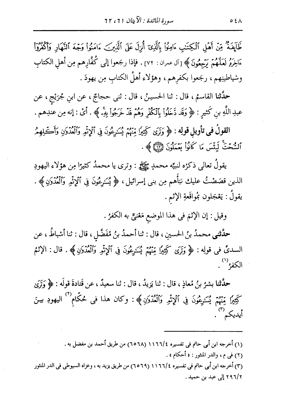 حَدَّثَنِي مُحَمَّدُ بْنُ الْحُسَيْنِ , قَالَ: ثنا أَحْمَدُ بْنُ مُفَضَّلٍ , قَالَ: ثنا أَسْبَاطٌ , عَنِ السُّدِّيِّ , فِي قَوْلِهِ: {§وَتَرَى كَثِيرًا مِنْهُمْ يُسَارِعُونَ فِي الْإِثْمِ وَالْعُدْوَانِ} [المائدة: 62] قَالَ: " الْإِثْمُ: الْكُفْرُ "