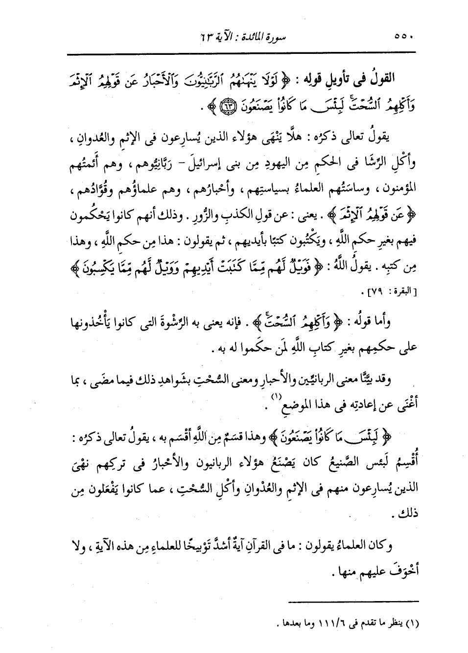 §الْقَوْلُ فِي تَأْوِيلِ قَوْلِهِ تَعَالَى: {لَوْلَا يَنْهَاهُمُ الرَّبَّانِيُّونَ وَالْأَحْبَارُ عَنْ قَوْلِهِمُ الْإِثْمَ وَأَكْلِهِمُ السُّحْتَ لَبِئْسَ مَا كَانُوا يَصْنَعُونَ} [المائدة: 63] يَقُولُ تَعَالَى ذِكْرُهُ: هَلَا يَنْهَى هَؤُلَاءِ الَّذِينَ يُسَارِعُونَ فِي الْإِثْمِ وَالْعُدْوَانِ وَأَكْلِ الرُّشَا فِي الْحُكْمِ مِنَ الْيَهُودِ مِنْ بَنِي إِسْرَائِيلَ رَبَّانِيُّوهُمْ , وَهُمْ أَئِمَّتُهُمُ الْمُؤْمِنُونَ , وَسَاسَتُهُمُ الْعُلَمَاءُ بِسِيَاسَتِهِمْ وَأَحْبَارَهُمْ , وَهُمْ عُلَمَاؤُهُمْ وَقُوَّادُهُمْ {عَنْ قَوْلِهِمُ الْإِثْمَ} [المائدة: 63] يَعْنِي: " عَنْ قَوْلِ الْكَذِبِ وَالزُّورِ؛ وَذَلِكَ أَنَّهُمْ كَانُوا يَحْكُمُونَ فِيهِمْ بِغَيْرِ حُكْمِ اللَّهِ , وَيَكْتُبُونَ كُتُبًا بِأَيْدِيهِمْ ثُمَّ يَقُولُونَ: هَذَا مِنْ حُكْمِ اللَّهِ , وَهَذَا مِنْ كُتُبِهِ. يَقُولُ اللَّهُ: {فَوَيْلٌ لَهُمْ مِمَّا كَتَبَتْ أَيْدِيهِمْ وَوَيْلٌ لَهُمْ مِمَّا يَكْسِبُونَ} [البقرة: 79] وَأَمَّا قَوْلُهُ: {وَأَكْلِهِمُ السُّحْتَ} [المائدة: 62] فَإِنَّهُ يَعْنِي بِهِ الرِّشْوَةَ الَّتِي كَانُوا يَأْخُذُونَهَا عَلَى حُكْمِهِمْ بِغَيْرِ كِتَابِ اللَّهِ لِمَنْ حَكَمُوا لَهُ بِهِ. وَقَدْ بَيَّنَّا مَعْنَى الرَّبَّانِيِّينَ وَالْأَحْبَارِ وَمَعْنَى السُّحْتِ بِشَوَاهِدِ ذَلِكَ فِيمَا مَضَى بِمَا أَغْنَى عَنْ إِعَادَتِهِ فِي هَذَا الْمَوْضِعِ. وَأَمَّا قَوْلُهُ: {لَبِئْسَ مَا كَانُوا يَصْنَعُونَ} [المائدة: 63] وَهَذَا قَسَمٌ مِنَ اللَّهِ أَقْسَمَ بِهِ , يَقُولُ تَعَالَى ذِكْرُهُ: أَقْسَمَ لَبِئْسَ الصَّنِيعُ كَانَ يَصْنَعُ هَؤُلَاءِ الرَّبَّانِيُّونَ وَالْأَحْبَارُ فِي تَرْكِهِمْ نَهْيَ الَّذِينَ يُسَارِعُونَ مِنْهُمْ فِي الْإِثْمِ وَالْعُدْوَانِ وَأَكْلِ السُّحْتِ عَمَّا كَانُوا يَفْعَلُونَ مِنْ ذَلِكَ. وَكَانَ الْعُلَمَاءُ يَقُولُونَ: مَا فِي الْقُرْآنِ آيَةٌ أَشَدَّ تَوْبِيخًا لِلْعُلَمَاءِ مِنْ هَذِهِ الْآيَةِ وَلَا أَخْوَفَ عَلَيْهِمْ مِنْهَا