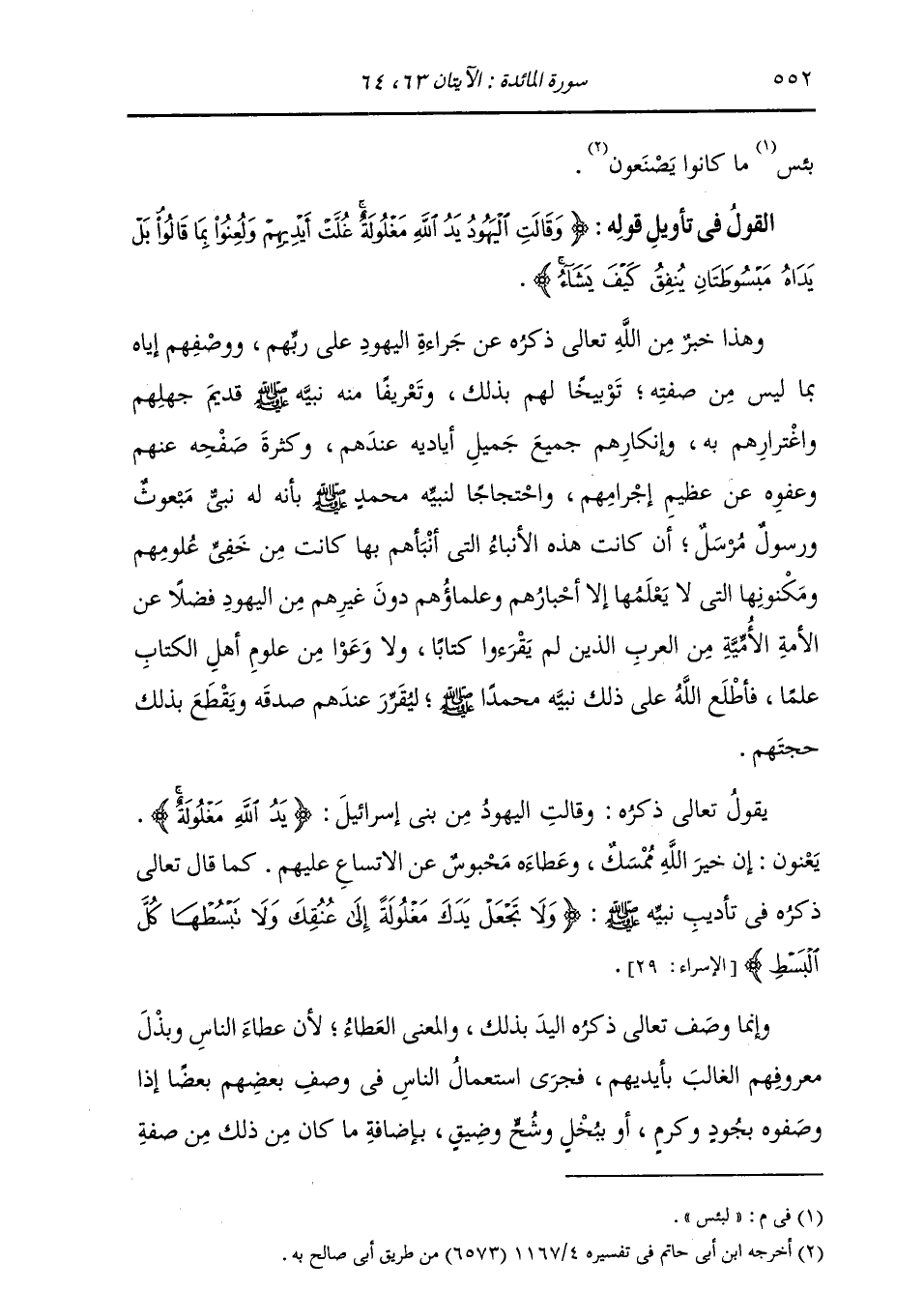 §الْقَوْلُ فِي تَأْوِيلِ قَوْلِهِ تَعَالَى: {وَقَالَتِ الْيَهُودُ يَدُ اللَّهِ مَغْلُولَةٌ غُلَّتْ أَيْدِيهِمْ وَلُعِنُوا بِمَا قَالُوا بَلْ يَدَاهُ مَبْسُوطَتَانِ يُنْفِقُ كَيْفَ يَشَاءُ وَلَيَزِيدَنَّ كَثِيرًا مِنْهُمْ مَا أُنْزِلَ إِلَيْكَ مِنْ رَبِّكَ طُغْيَانًا وَكُفْرًا وَأَلْقَيْنَا بَيْنَهُمُ الْعَدَاوَةَ وَالْبَغْضَاءَ إِلَى يَوْمِ الْقِيَامَةِ كُلَّمَا أَوْقَدُوا نَارًا لِلْحَرْبِ أَطْفَأَهَا اللَّهُ وَيَسْعَوْنَ فِي الْأَرْضِ فَسَادًا وَاللَّهُ لَا يُحِبُّ الْمُفْسِدِينَ} [المائدة: 64] وَهَذَا خَبَرٌ مِنَ اللَّهِ تَعَالَى ذِكْرُهُ عَنْ جَرَاءَةِ الْيَهُودِ عَلَى رَبِّهِمْ وَوَصْفِهِمْ إِيَّاهُ بِمَا لَيْسَ مِنْ صِفَتِهِ , تَوْبِيخًا لَهُمْ بِذَلِكَ وَتَعْرِيفًا مِنْهُ نَبِيَّهُ صَلَّى اللهُ عَلَيْهِ وَسَلَّمَ قَدِيمَ جَهْلِهِمْ وَاغْتِرَارَهُمْ بِهِ وَإِنْكَارَهُمْ جَمِيعَ جَمِيلِ أَيَادِيهِ عِنْدَهُمْ وَكَثْرَةَ صَفْحِهِ عَنْهُمْ وَعَفْوِهِ عَنْ عَظِيمِ إِجْرَامِهِمْ , وَاحْتِجَاجًا لِنَبِيِّهِ مُحَمَّدٍ صَلَّى اللهُ عَلَيْهِ وَسَلَّمَ بِأَنَّهُ لَهُ نَبِيُّ مَبْعُوثٌ وَرَسُولٌ مُرْسَلٌ أَنْ كَانَتْ هَذِهِ الْأَنْبَاءُ الَّتِي أَنْبَأَهُمْ بِهَا كَانَتْ مِنْ خَفِيِّ عُلُومِهِمْ وَمَكْنُونِهَا الَّتِي لَا يَعْلَمُهَا إِلَّا أَحْبَارُهُمْ وَعُلَمَاؤُهُمْ دُونَ غَيْرِهِمْ مِنَ الْيَهُودِ فَضْلًا فَأَطْلَعَ اللَّهُ عَلَى ذَلِكَ نَبِيَّهُ مُحَمَّدًا صَلَّى اللهُ عَلَيْهِ وَسَلَّمَ لِيُقَرِّرَ عِنْدَهُمْ صِدْقَهُ وَيَقْطَعَ بِذَلِكَ حُجَّتَهُمْ. يَقُولُ تَعَالَى ذِكْرُهُ: {وَقَالَتِ الْيَهُودُ} [البقرة: 113] مِنْ بَنِي إِسْرَائِيلَ {يَدُ اللَّهِ مَغْلُولَةٌ} [المائدة: 64] يَعْنُونَ: أَنَّ خَيْرَ اللَّهِ مُمْسَكٌ , وَعَطَاءُهُ مَحْبُوسٌ عَنِ الِاتِّسَاعِ عَلَيْهِمْ , كَمَا قَالَ تَعَالَى ذِكْرُهُ فِي تَأْدِيبِ نَبِيِّهِ صَلَّى اللهُ عَلَيْهِ وَسَلَّمَ: {وَلَا تَجْعَلْ يَدَكَ مَغْلُولَةٌ إِلَى عُنُقِكَ وَلَا تَبْسُطْهَا كُلَّ الْبَسْطِ} [الإسراء: 29] وَإِنَّمَا وَصَفَ تَعَالَى ذِكْرُهُ الْيَدَ بِذَلِكَ , وَالْمَعْنَى: الْعَطَاءُ , لِأَنَّ عَطَاءَ النَّاسِ وَبَذْلَ مَعْرُوفِهِمُ الْغَالِبَ بِأَيْدِيهِمْ , فَجَرَى اسْتِعْمَالُ النَّاسِ فِي وَصْفِ بَعْضِهِمْ بَعْضًا إِذَا وَصَفُوهُ بِجُودٍ وَكَرَمٍ أَوْ بِبُخْلٍ وَشُحٍّ وَضِيقٍ , بِإِضَافَةِ مَا كَانَ مِنْ ذَلِكَ مِنْ صِفَةِ