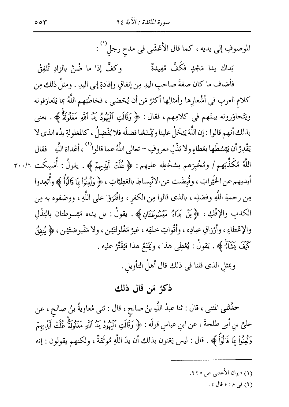 ذِكْرُ مَنْ قَالَ ذَلِكَ: حَدَّثَنِي الْمُثَنَّى , قَالَ: ثنا عَبْدُ اللَّهِ بْنُ صَالِحٍ , قَالَ: ثني مُعَاوِيَةُ بْنُ صَالِحٍ , عَنْ عَلِيِّ بْنِ أَبِي طَلْحَةَ , عَنِ ابْنِ عَبَّاسٍ , قَوْلُهُ: {§وَقَالَتِ الْيَهُودُ يَدُ اللَّهِ مَغْلُولَةٌ غُلَّتْ أَيْدِيهِمْ وَلُعِنُوا بِمَا قَالُوا} [المائدة: 64] قَالَ: لَيْسَ يَعْنُونَ بِذَلِكَ أَنَّ يَدَ اللَّهِ مُوثَقَةٌ , وَلَكِنَّهُمْ يَقُولُونَ: إِنَّهُ -[554]- بَخِيلٌ أَمْسَكَ مَا عِنْدَهُ. تَعَالَى اللَّهُ عَمَّا يَقُولُونَ عُلُوًّا كَبِيرًا "