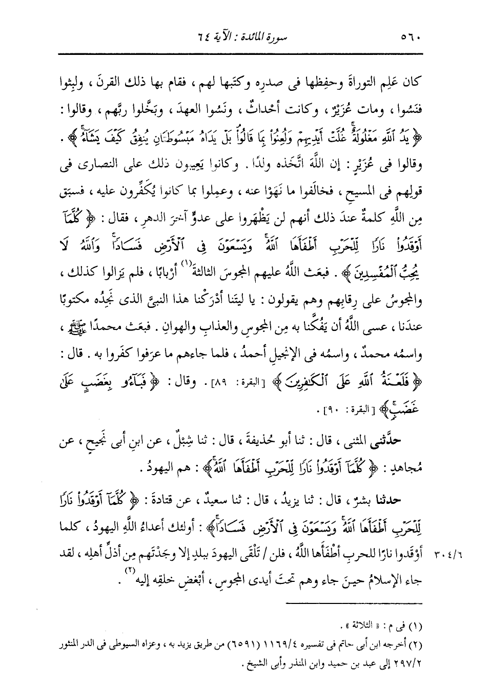 حَدَّثَنَا بِشْرٌ , قَالَ: ثنا يَزِيدُ , قَالَ: ثنا سَعِيدٌ , عَنْ قَتَادَةَ: {§كُلَّمَا أَوْقَدُوا نَارًا لِلْحَرْبِ أَطْفَأَهَا اللَّهُ وَيَسْعَوْنَ فِي الْأَرْضِ فَسَادًا} [المائدة: 64] أُولَئِكَ أَعْدَاءُ اللَّهِ الْيَهُودُ , كُلَّمَا أَوْقَدُوا نَارًا لِلْحَرْبِ أَطْفَأَهَا اللَّهُ , فَلَنْ تَلْقَى الْيَهُودَ بِبَلَدٍ إِلَّا وَجَدْتَهُمْ مِنْ أَذَلَّ أَهْلِهِ , لَقَدْ جَاءَ الْإِسْلَامُ حِينَ جَاءَ وَهُمْ تَحْتَ أَيْدِي الْمَجُوسِ أَبْغَضِ خَلْقِهِ إِلَيْهِ "