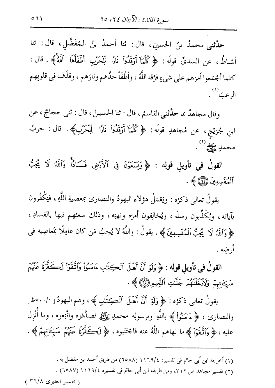 وَقَالَ مُجَاهِدٌ بِمَا: حَدَّثَنِي الْقَاسِمُ , قَالَ: ثنا الْحُسَيْنُ , قَالَ: ثني حَجَّاجٌ , عَنِ ابْنِ جُرَيْجٍ , عَنْ مُجَاهِدٍ , قَوْلُهُ: {§كُلَّمَا أَوْقَدُوا نَارًا لِلْحَرْبِ أَطْفَأَهَا اللَّهُ} [المائدة: 64] قَالَ: «حَرْبُ مُحَمَّدٍ صَلَّى اللهُ عَلَيْهِ وَسَلَّمَ»