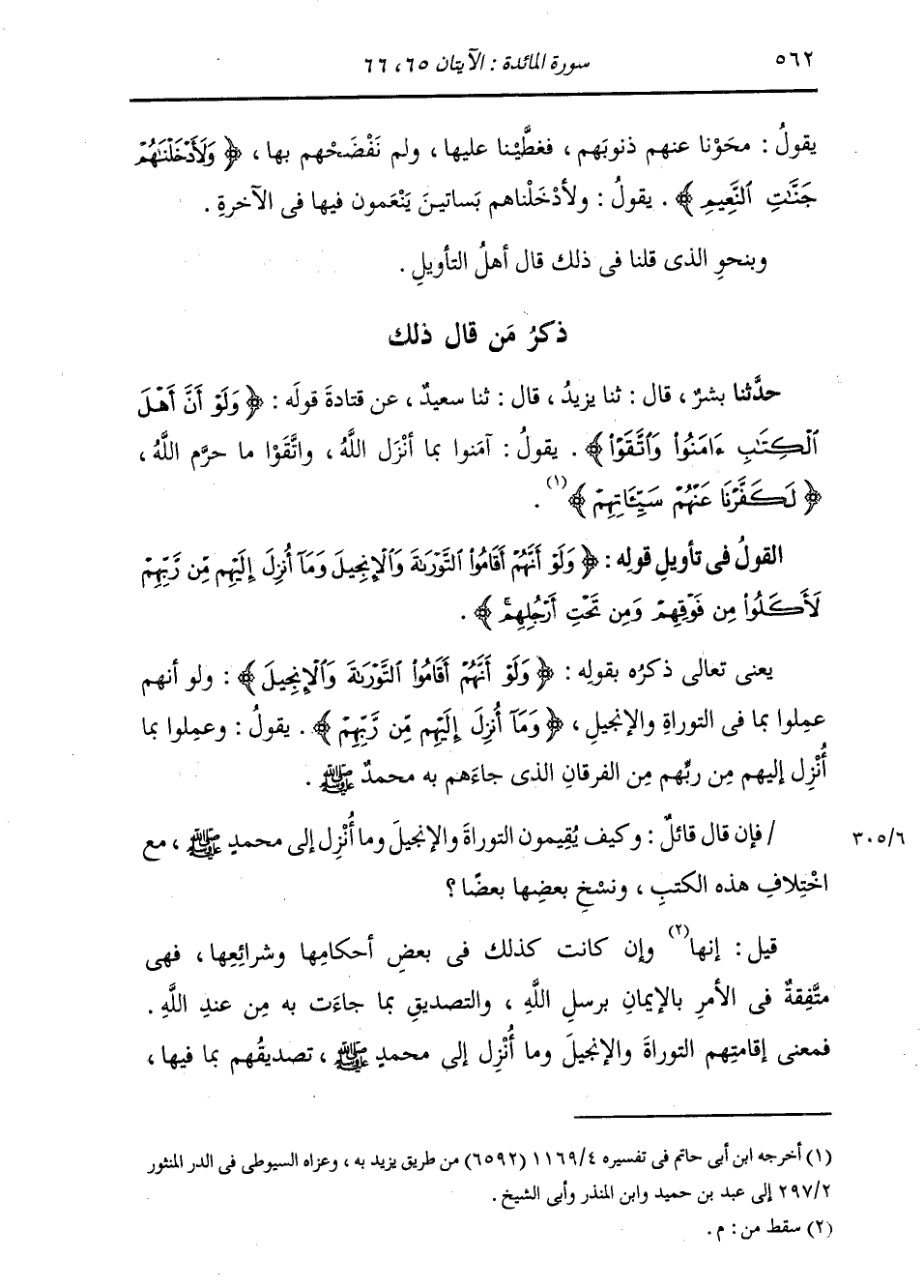 §الْقَوْلُ فِي تَأْوِيلِ قَوْلِهِ تَعَالَى: {وَلَوْ أَنَّهُمْ أَقَامُوا التَّوْرَاةَ وَالْإِنْجِيلَ وَمَا أُنْزِلَ إِلَيْهِمْ مِنْ رَبِّهِمْ لَأَكَلُوا مِنْ فَوْقِهِمْ وَمِنْ تَحْتِ أَرْجُلِهِمْ مِنْهُمْ أُمَّةٌ مُقْتَصِدَةٌ وَكَثِيرٌ مِنْهُمْ سَاءَ مَا يَعْمَلُونَ} [المائدة: 66] يَعْنِي تَعَالَى ذِكْرُهُ بِقَوْلِهِ: {وَلَوْ أَنَّهُمْ أَقَامُوا التَّوْرَاةَ وَالْإِنْجِيلَ} [المائدة: 66] وَلَوْ أَنَّهُمْ عَمِلُوا بِمَا فِي التَّوْرَاةِ وَالْإِنْجِيلِ {وَمَا أُنْزِلَ إِلَيْهِمْ مِنْ رَبِّهِمْ} [المائدة: 66] يَقُولُ: " وَعَمِلُوا بِمَا أُنْزِلَ إِلَيْهِمْ مِنْ رَبِّهِمْ مِنَ الْفُرْقَانِ الَّذِي جَاءَهُمْ بِهِ مُحَمَّدٌ صَلَّى اللهُ عَلَيْهِ وَسَلَّمَ. فَإِنْ قَالَ قَائِلٌ: وَكَيْفَ يُقِيمُونَ التَّوْرَاةَ وَالْإِنْجِيلَ وَمَا أُنْزِلَ إِلَى مُحَمَّدٍ صَلَّى اللهُ عَلَيْهِ وَسَلَّمَ , مَعَ اخْتِلَافِ هَذِهِ الْكُتُبِ وَنَسْخِ بَعْضِهَا بَعْضًا؟ قِيلَ: وَإِنْ كَانَتْ كَذَلِكَ فِي بَعْضِ أَحْكَامِهَا وَشَرَائِعِهَا , فَهِيَ مُتَّفِقَةٌ فِي الْأَمْرِ بِالْإِيمَانِ بِرُسُلِ اللَّهِ وَالتَّصْدِيقِ بِمَا جَاءَتْ بِهِ مِنْ عِنْدِ اللَّهِ؛ فَمَعْنَى إِقَامَتِهِمُ التَّوْرَاةَ وَالْإِنْجِيلَ وَمَا أُنْزِلَ إِلَى مُحَمَّدٍ صَلَّى اللهُ عَلَيْهِ وَسَلَّمَ تَصْدِيقُهُمْ بِمَا فِيهَا