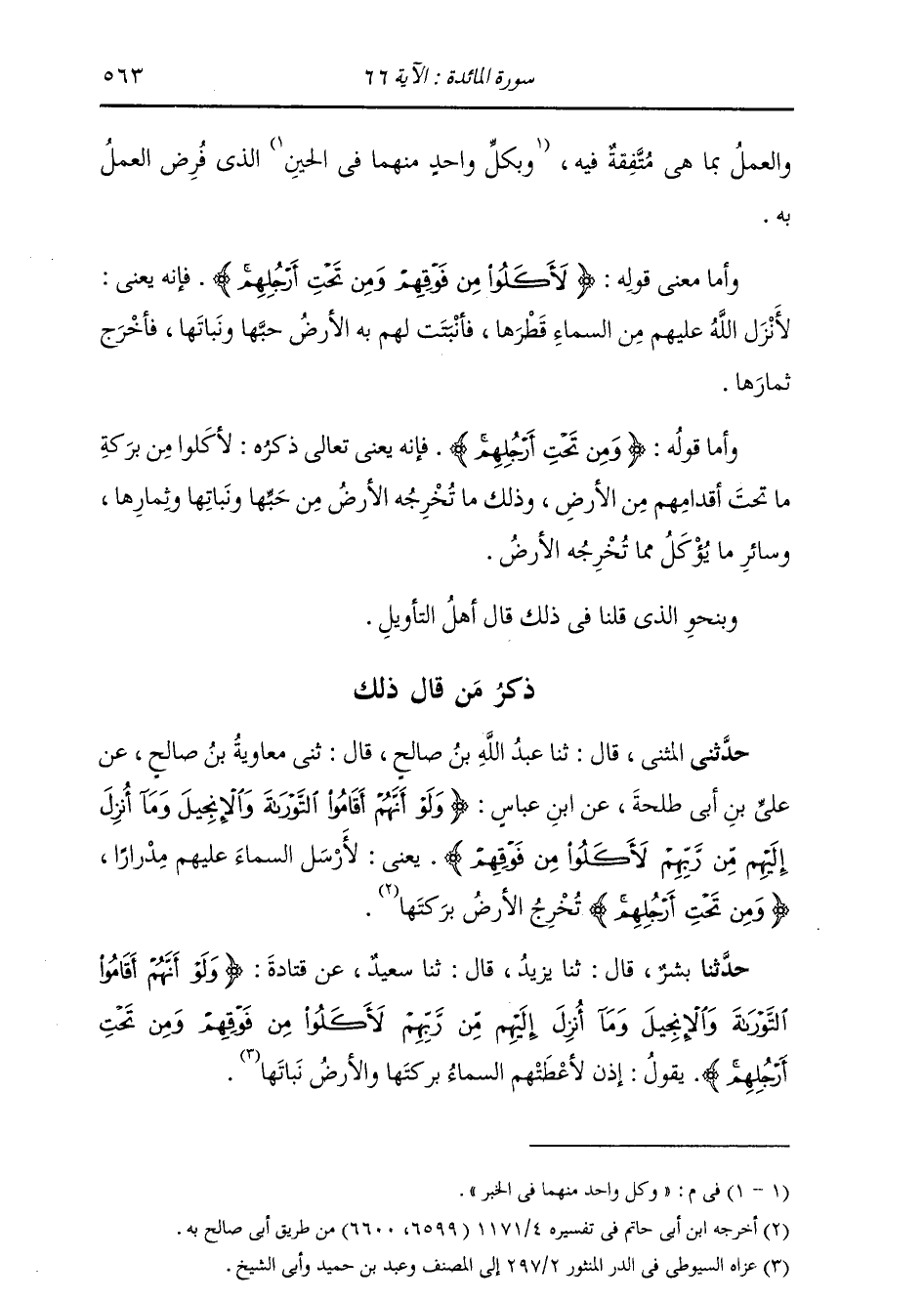 ذِكْرُ مَنْ قَالَ ذَلِكَ: حَدَّثَنِي الْمُثَنَّى , قَالَ: ثنا عَبْدُ اللَّهِ بْنُ صَالِحٍ , قَالَ: ثني مُعَاوِيَةُ بْنُ صَالِحٍ , عَنْ عَلِيِّ بْنِ أَبِي طَلْحَةَ , عَنِ ابْنِ عَبَّاسٍ: {§وَلَوْ أَنَّهُمْ أَقَامُوا التَّوْرَاةَ وَالْإِنْجِيلَ وَمَا أُنْزِلَ إِلَيْهِمْ مِنْ رَبِّهِمْ لَأَكَلُوا مِنْ فَوْقِهِمْ} [المائدة: 66] يَعْنِي: " لَأَرْسَلَ السَّمَاءَ عَلَيْهِمْ مِدْرَارًا {وَمِنْ تَحْتِ أَرْجُلِهِمْ} [المائدة: 66] تُخْرِجُ الْأَرْضُ بَرَكَتَهَا "