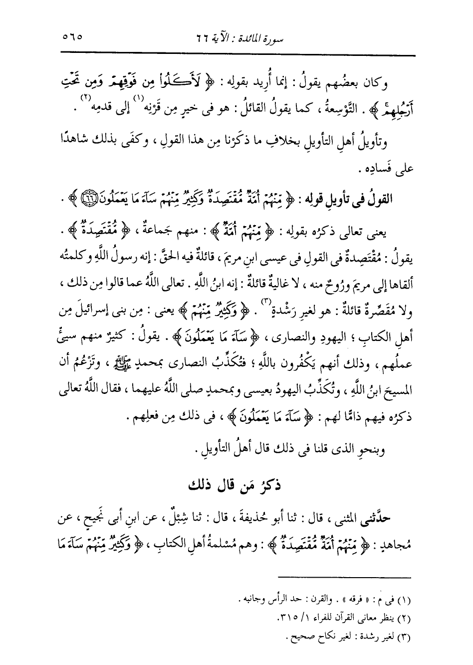 ذِكْرُ مَنْ قَالَ ذَلِكَ: حَدَّثَنِي الْمُثَنَّى , قَالَ: ثنا أَبُو حُذَيْفَةَ , قَالَ: ثنا شِبْلٌ , عَنِ ابْنِ أَبِي نَجِيحٍ , عَنْ مُجَاهِدٍ: {§مِنْهُمْ أُمَّةٌ مُقْتَصِدَةٌ} [المائدة: 66] وَهُمْ مُسْلِمَةُ أَهْلِ الْكِتَابِ {وَكَثِيرٌ مِنْهُمْ سَاءَ مَا -[566]- يَعْمَلُونَ} [المائدة: 66] "
