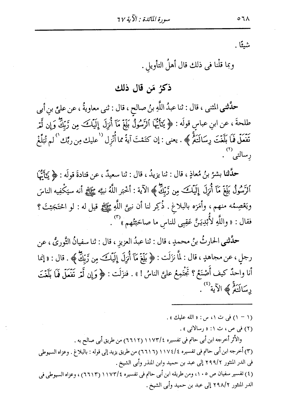ذِكْرُ مَنْ قَالَ ذَلِكَ: حَدَّثَنِي الْمُثَنَّى , قَالَ: ثنا عَبْدُ اللَّهِ بْنُ صَالِحٍ , قَالَ: ثني مُعَاوِيَةُ , عَنْ عَلِيِّ بْنِ أَبِي طَلْحَةَ , عَنِ ابْنِ عَبَّاسٍ , قَوْلُهُ: {§يَا أَيُّهَا الرَّسُولُ بَلِّغْ مَا أُنْزِلَ إِلَيْكَ مِنْ رَبِّكَ وَإِنْ لَمْ تَفْعَلْ فَمَا بَلَّغْتَ رِسَالَتَهُ} [المائدة: 67] يَعْنِي: «إِنْ كَتَمْتَ آيَةً مِمَّا أُنْزِلَ عَلَيْكَ مِنْ رَبِّكَ , لَمْ تُبَلِّغْ رِسَالَتِي»