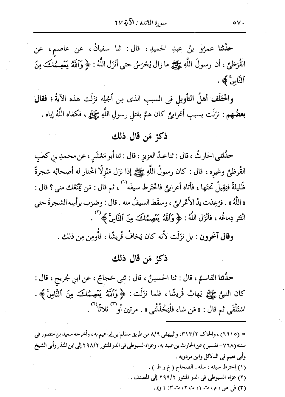 حَدَّثَنَا عَمْرُو بْنُ عَبْدِ الْحَمِيدِ , قَالَ: ثنا سُفْيَانُ , عَنْ عَاصِمٍ , عَنِ الْقُرَظِيِّ: أَنَّ رَسُولَ اللَّهِ صَلَّى اللهُ عَلَيْهِ وَسَلَّمَ مَا زَالَ يُحْرَسُ حَتَّى أَنْزَلَ اللَّهُ: {§وَاللَّهُ يَعْصِمُكَ مِنَ النَّاسِ} [المائدة: 67] " وَاخْتَلَفَ أَهْلُ التَّأْوِيلِ فِي السَّبَبِ الَّذِي مِنْ أَجْلِهِ نَزَلَتْ هَذِهِ الْآيَةُ , فَقَالَ بَعْضُهُمْ: نَزَلَتْ بِسَبَبِ أَعْرَابِيٍّ كَانَ هَمَّ بِقَتْلِ رَسُولِ اللَّهِ صَلَّى اللهُ عَلَيْهِ وَسَلَّمَ , فَكَفَاهُ اللَّهُ إِيَّاهُ