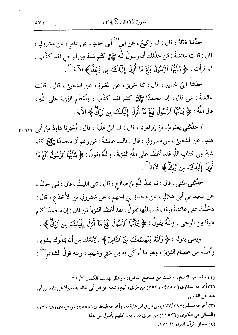 حَدَّثَنِي الْمُثَنَّى , قَالَ: ثنا عَبْدُ اللَّهِ بْنُ صَالِحٍ , قَالَ: ثني اللَّيْثُ , قَالَ: ثني خَالِدٌ , عَنْ سَعِيدِ بْنِ أَبِي هِلَالٍ , عَنْ مُحَمَّدِ بْنِ الْحَمِيمِ , عَنْ مَسْرُوقِ بْنِ الْأَجْدَعِ , قَالَ: دَخَلْتُ عَلَى عَائِشَةَ يَوْمًا , فَسَمِعْتُهَا تَقُولُ: لَقَدْ أَعْظَمَ الْفِرْيَةَ مَنْ قَالَ: إِنَّ مُحَمَّدًا كَتَمَ شَيْئًا مِنَ الْوَحْيِ , وَاللَّهُ يَقُولُ: {§يَا أَيُّهَا الرَّسُولُ بَلِّغْ مَا أُنْزِلَ إِلَيْكَ مِنْ رَبِّكَ} [المائدة: 67] " وَيَعْنِي بِقَوْلِهِ: {وَاللَّهُ يَعْصِمُكَ مِنَ النَّاسِ} [المائدة: 67] يَمْنَعُكَ مِنْ أَنْ يَنَالُوكَ بِسُوءٍ , وَأَصْلُهُ مِنْ عِصَامِ الْقِرْبَةِ , وَهُوُ مَا تُوكَأُ بِهِ مِنْ سَيْرِ وَخَيْطٍ , وَمِنْهُ قَوْلُ الشَّاعِرِ: