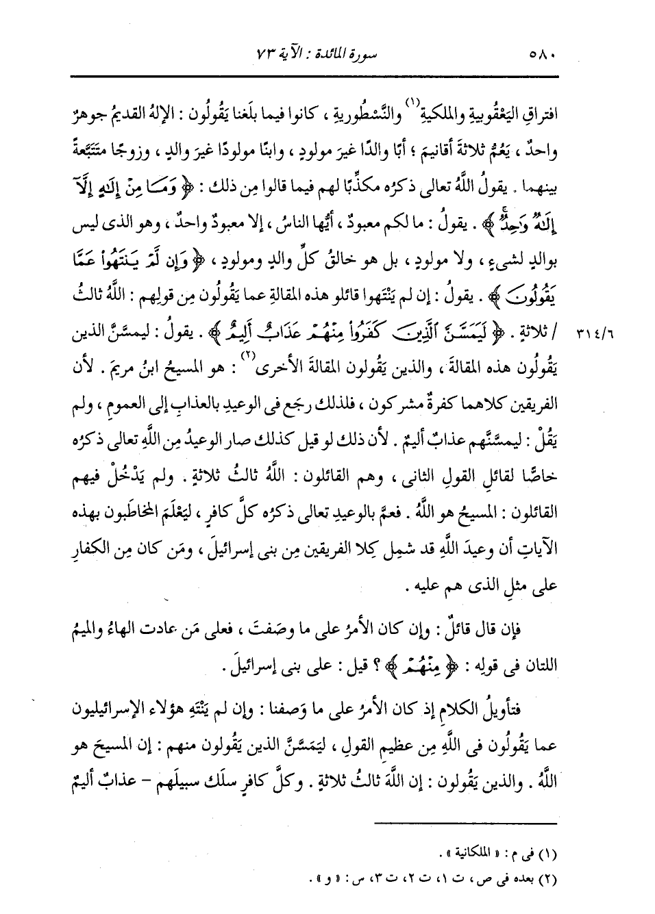 افْتِرَاقِ الْيَعْقُوبِيَّةِ وَالْمِلْكَانِيَّةِ وَالنَّسْطُورِيَّةِ , كَانُوا فِيمَا بَلَغَنَا يَقُولُونَ: الْإِلَهُ الْقَدِيمُ جَوْهَرٌ وَاحِدٌ يَعُمُّ ثَلَاثَةَ أَقَانِيمَ: أَبًا وَالِدًا غَيْرَ مَوْلُودٍ , وَابْنًا مَوْلُودًا غَيْرَ وَالِدٍ , وَزَوْجًا مُتَتَبَّعَةً بَيْنَهُمَا. يَقُولُ اللَّهُ تَعَالَى ذِكْرُهُ مُكَذِّبًا لَهُمْ فِيمَا قَالُوا مِنْ ذَلِكَ: {وَمَا مِنْ إِلَهٍ إِلَّا إِلَهٌ وَاحِدٌ} [المائدة: 73] يَقُولُ: " مَا لَكُمْ مَعْبُودٌ أَيُّهَا النَّاسُ إِلَّا مَعْبُودٌ وَاحِدٌ , وَهُوَ الَّذِي لَيْسَ بِوَالِدٍ لِشَيْءٍ وَلَا مَوْلُودٍ , بَلْ هُوَ خَالِقُ كُلِّ وَالِدٍ وَمَوْلُودٍ {وَإِنْ لَمْ يَنْتَهُوا عَمَّا يَقُولُونَ} [المائدة: 73] يَقُولُ: " إِنْ لَمْ يَنْتَهُوا قَائِلُو هَذِهِ الْمَقَالَةِ عَمَّا يَقُولُونَ مِنْ قَوْلِهِمُ: اللَّهُ ثَالِثُ ثَلَاثَةٍ {لَيَمَسَنَّ الَّذِينَ كَفَرُوا مِنْهُمْ عَذَابٌ أَلِيمٌ} [المائدة: 73] يَقُولُ: " لَيَمَسَّنَّ الَّذِينَ يَقُولُونَ هَذِهِ الْمَقَالَةَ , وَالَّذِينَ يَقُولُونَ الْمَقَالَةَ الْأُخْرَى هُوَ الْمَسِيحُ ابْنُ مَرْيَمَ؛ لِأَنَّ الْفَرِيقَيْنِ كِلَاهُمَا كَفَرَةٌ مُشْرِكُونَ , فَلِذَلِكَ رَجَعَ فِي الْوَعِيدِ بِالْعَذَابِ إِلَى الْعُمُومِ. وَلَمْ يَقُلْ: لَيَمَسَّنَّهُمْ عَذَابٌ أَلِيمٌ , لِأَنَّ ذَلِكَ لَوْ قِيلَ كَذَلِكَ صَارَ الْوَعِيدُ مِنَ اللَّهِ تَعَالَى ذِكْرُهُ خَاصًّا لِقَائِلِ الْقَوْلِ الثَّانِي , وَهُمُ الْقَائِلُونَ: اللَّهُ ثَالِثُ ثَلَاثَةٍ , وَلَمْ يَدْخُلْ فِيهِمُ الْقَائِلُونَ: الْمَسِيحُ هُوَ اللَّهُ. فعَمَّ بِالْوَعِيدِ تَعَالَى ذِكْرُهُ كُلَّ كَافِرٍ , لِيَعْلَمَ الْمُخَاطَبُونَ بِهَذِهِ الْآيَاتِ أَنَّ وَعِيدَ اللَّهِ قَدْ شَمِلَ كِلَا الْفَرِيقَيْنِ مِنْ بَنِي إِسْرَائِيلَ وَمَنْ كَانَ مِنَ الْكُفَّارِ عَلَى مِثْلِ الَّذِي هُمْ عَلَيْهِ فَإِنْ قَالَ قَائِلٌ: وَإِنْ كَانَ الْأَمْرُ عَلَى مَا وَصَفْتَ فَعَلَى مَنْ عَادَتِ الْهَاءُ وَالْمِيمُ اللَّتَانِ فِي قَوْلِهِ: مِنْهُمْ؟ قِيلَ: عَلَى بَنِي إِسْرَائِيلَ. فَتَأْوِيلُ الْكَلَامِ إِذْ كَانَ الْأَمْرُ عَلَى مَا وَصَفْنَا: وَإِنْ لَمْ يَنْتَهِ هَؤُلَاءِ الْأَسْرَائِيلِيُّونَ عَمَّا يَقُولُونَ فِي اللَّهِ مِنْ عَظِيمِ الْقَوْلِ , لَيَمَسَّنَّ الَّذِينَ يَقُولُونَ مِنْهُمْ إِنَّ الْمَسِيحَ هُوَ اللَّهُ وَالَّذِينَ يَقُولُونَ إِنَّ اللَّهَ ثَالِثُ ثَلَاثَةٍ وَكُلُّ كَافِرٍ سَلَكَ سَبِيلَهُمْ عَذَابٌ أَلِيمٌ