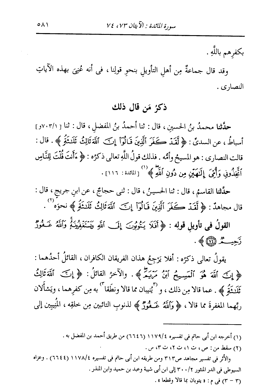ذِكْرُ مَنْ قَالَ ذَلِكَ: حَدَّثَنَا مُحَمَّدُ بْنُ الْحُسَيْنِ , قَالَ: ثنا أَحْمَدُ بْنُ الْمُفَضَّلِ , قَالَ: ثنا أَسْبَاطٌ , عَنِ السُّدِّيِّ: §لَقَدْ كَفَرَ الَّذِينَ قَالُوا إِنَّ اللَّهَ ثَالِثُ ثَلَاثَةٍ قَالَ: " قَالَتِ النَّصَارَى: هُوَ الْمَسِيحُ وَأُمُّهُ , فَذَلِكَ قَوْلُ اللَّهِ تَعَالَى: أَأَنْتَ قُلْتَ لِلنَّاسِ اتَّخِذُونِي وَأُمِّيَ إِلَهَيْنِ مِنْ دُونِ اللَّهِ " حَدَّثَنَا الْقَاسِمُ , قَالَ: ثنا الْحُسَيْنُ , قَالَ: ثني حَجَّاجٌ , عَنِ ابْنِ جُرَيْجٍ , قَالَ: قَالَ مُجَاهِدٌ: لَقَدْ كَفَرَ الَّذِينَ قَالُوا إِنَّ اللَّهَ ثَالِثُ ثَلَاثَةٍ نَحْوَهُ