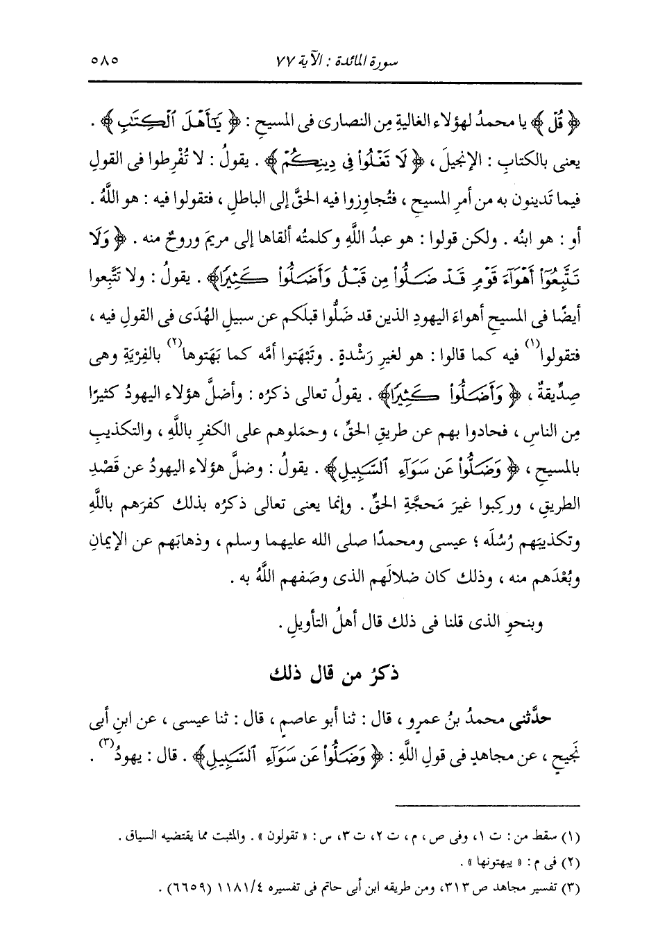 قُلْ يَا مُحَمَّدُ لِهَؤُلَاءِ الْغَالِيَةِ مِنَ النَّصَارَى فِي الْمَسِيحِ: {يَا أَهْلَ الْكِتَابِ} [آل عمران: 64] يَعْنِي بِالْكِتَابِ: الْإِنْجِيلَ {لَا تَغْلُوا فِي دِينِكُمْ} [النساء: 171] يَقُولُ: " لَا تَفْرُطُوا فِي الْقَوْلِ فِيمَا تَدِينُونَ بِهِ مِنْ أَمْرِ الْمَسِيحِ , فَتُجَاوِزُوا فِيهِ الْحَقَّ إِلَى الْبَاطِلِ , فَتَقُولُوا فِيهِ: هُوَ اللَّهُ , أَوْ هُوَ ابْنُهُ؛ وَلَكِنْ قُولُوا: هُوَ عَبْدُ اللَّهِ وَكَلِمَتُهُ أَلْقَاهَا إِلَى مَرْيَمَ وَرَوْحٌ مِنْهُ {وَلَا تَتَّبِعُوا أَهْوَاءَ قَوْمٍ قَدْ ضَلُّوا مِنْ قَبْلُ وَأَضَلُّوا كَثِيرًا} [المائدة: 77] وَيَقُولُ: وَلَا تَتَّبِعُوا أَيْضًا فِي الْمَسِيحِ أَهْوَاءَ الْيَهُودِ الَّذِينَ قَدْ ضَلُّوا قَبْلَكُمْ عَنْ سَبِيلِ الْهُدَى فِي الْقَوْلِ فِيهِ , فَتَقُولُونَ فِيهِ كَمَا قَالُوا: هُوَ لِغَيْرِ رِشْدَةٍ , وَتَبْهَتُوا أُمَّهُ كَمَا يَبْهَتُونَهَا بِالْفِرْيَةِ , وَهِيَ صِدِّيقَةٌ. {وَأَضَلُّوا كَثِيرًا} [المائدة: 77] يَقُولُ تَعَالَى ذِكْرُهُ: وَأَضَلَّ هَؤُلَاءِ الْيَهُودُ كَثِيرًا مِنَ النَّاسِ , فَحَادُوا بِهِمْ عَنْ طَرِيقِ الْحَقِّ وَحَمَلُوهُمْ عَلَى الْكُفْرِ بِاللَّهِ وَالتَّكْذِيبِ بِالْمَسِيحِ {وَضَلُّوا عَنْ سَوَاءِ السَّبِيلِ} [المائدة: 77] يَقُولُ: " وَضَلَّ هَؤُلَاءِ الْيَهُودُ عَنْ قَصْدِ الطَّرِيقِ , وَرَكِبُوا غَيْرَ مَحَجَّةِ الْحَقِّ وَإِنَّمَا يَعْنِي تَعَالَى ذِكْرُهُ بِذَلِكَ كُفْرَهُمْ بِاللَّهِ وَتَكْذِيبَهُمْ رُسُلَهُ عِيسَى وَمُحَمَّدًا صَلَّى اللهُ عَلَيْهِ وَسَلَّمَ , وَذَهَابَهُمْ عَنِ الْإِيمَانِ وَبُعْدَهُمْ مِنْهُ. وَذَلِكَ كَانَ ضَلَالَهُمُ الَّذِي وَصَفَهُمُ اللَّهُ بِهِ. وَبِنَحْوِ الَّذِي قُلْنَا فِي ذَلِكَ قَالَ أَهْلُ التَّأْوِيلِ
