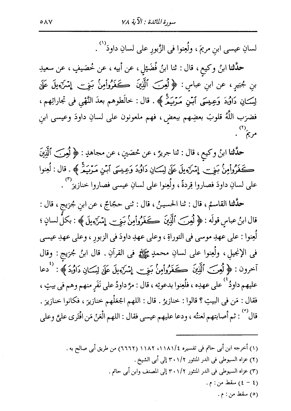 حَدَّثَنَا الْقَاسِمُ , قَالَ: ثنا الْحُسَيْنُ , قَالَ: ثني حَجَّاجٌ , عَنِ ابْنِ جُرَيْجٍ , قَالَ: قَالَ ابْنُ عَبَّاسٍ , قَوْلُهُ: {§لُعِنَ الَّذِينَ كَفَرُوا مِنْ بَنِي إِسْرَائِيلَ} [المائدة: 78] بِكُلِّ لِسَانٍ؛ لُعِنُوا عَلَى عَهْدِ مُوسَى فِي التَّوْرَاةِ , وَعَلَى عَهْدِ دَاوُدَ فِي الزَّبُورِ , وَعَلَى عَهْدِ عِيسَى فِي الْإِنْجِيلِ , وَلُعِنُوا عَلَى لِسَانِ مُحَمَّدٍ صَلَّى اللهُ عَلَيْهِ وَسَلَّمَ فِي الْقُرْآنِ " قَالَ ابْنُ جُرَيْجٍ , وَقَالَ آخَرُونَ: {لُعِنَ الَّذِينَ كَفَرُوا مِنْ بَنِي إِسْرَائِيلَ عَلَى لِسَانِ دَاوُدَ} عَلَى عَهْدِهِ , فَلُعِنُوا بِدَعْوَتِهِ. قَالَ: مَرَّ دَاوُدُ عَلَى نَفَرٍ مِنْهُمْ وَهُمْ فِي بَيْتٍ , فَقَالَ مَنْ فِي الْبَيْتِ؟ قَالُوا: خَنَازِيرُ , قَالَ: اللَّهُمَّ اجْعَلْهُمْ خَنَازِيرَ. فكَانُوا خَنَازِيرَ؛ ثُمَّ أَصَابَتْهُمْ لَعَنْتُهُ. ودَعَا عَلَيْهِمْ عِيسَى فَقَالَ: اللَّهُمَّ الْعَنْ مَنِ افْتَرَى عَلَيَّ وَعَلَى -[588]- أُمِّي , وَاجْعَلْهُمْ قِرَدَةً خَاسِئِينَ