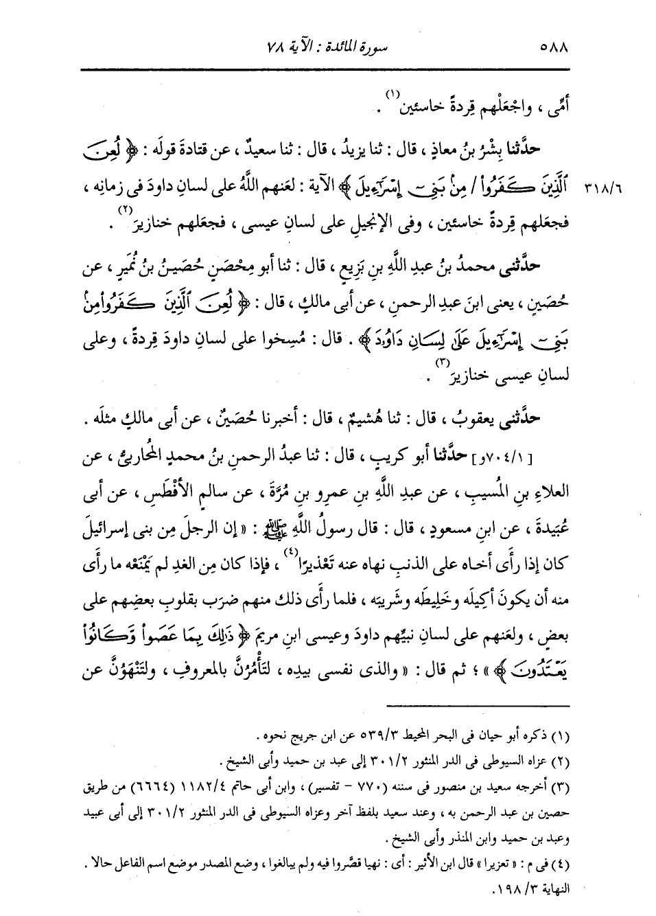 حَدَّثَنِي مُحَمَّدُ بْنُ عَبْدِ اللَّهِ بْنِ بَزِيعٍ , قَالَ: ثنا أَبُو مِحْصَنٍ حُصَيْنُ بْنُ نُمَيْرٍ , عَنْ حُصَيْنٍ , يَعْنِي ابْنَ عَبْدِ الرَّحْمَنِ , عَنْ أَبِي مَالِكٍ , قَالَ: {§لُعِنَ الَّذِينَ كَفَرُوا مِنْ بَنِي إِسْرَائِيلَ عَلَى لِسَانِ دَاوُدَ} قَالَ: «مُسِخُوا عَلَى لِسَانِ دَاوُدَ قِرَدَةً , وَعَلَى لِسَانِ عِيسَى خَنَازِيرَ» حَدَّثَنِي يَعْقُوبُ , قَالَ: ثنا هُشَيْمٌ , قَالَ: أَخْبَرَنَا حُصَيْنٌ , عَنْ أَبِي مَالِكٍ , مِثْلَهُ