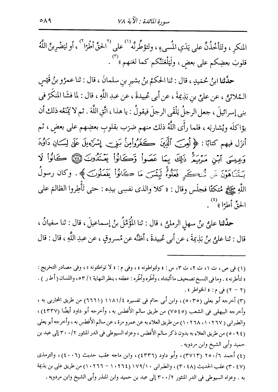 حَدَّثَنَا ابْنُ حُمَيْدٍ , قَالَ: ثنا الْحَكَمُ بْنُ بَشِيرِ بْنِ سَلْمَانَ , قَالَ: ثنا عَمْرُو بْنُ قَيْسٍ الْمُلَائِيُّ , عَنْ عَلِيِّ بْنِ بَذِيمَةَ , عَنْ أَبِي عُبَيْدَةَ , عَنْ عَبْدِ اللَّهِ , قَالَ: لَمَّا فَشَا الْمُنْكَرُ فِي بَنِي إِسْرَائِيلَ , جَعَلَ الرَّجُلُ يَلْقَى الرَّجُلَ فَيَقُولُ: يَا هَذَا اتَّقِ اللَّهَ. ثُمَّ لَا يَمْنَعُهُ ذَلِكَ أَنْ يُؤَاكِلَهُ وَيُشَارِبَهُ. فَلَمَّا رَأَى اللَّهُ ذَلِكَ مِنْهُمْ ضَرَبَ بِقُلُوبِ بَعْضِهِمْ عَلَى بَعْضٍ , ثُمَّ أَنْزَلَ فِيهِمْ كِتَابًا: {§لُعِنَ الَّذِينَ كَفَرُوا مِنْ بَنِي إِسْرَائِيلَ عَلَى لِسَانِ دَاوُدَ وَعِيسَى ابْنِ مَرْيَمَ ذَلِكَ بِمَا عَصَوْا وَكَانُوا يَعْتَدُونَ} كَانُوا لَا يَتَنَاهَوْنَ عَنْ مُنْكَرٍ فَعَلُوهُ لَبِئْسَ مَا كَانُوا يَفْعَلُونَ وَكَانَ رَسُولُ اللَّهِ صَلَّى اللهُ عَلَيْهِ وَسَلَّمَ مُتَّكِئًا , فَجَلَسَ وَقَالَ: «كَلَا وَالَّذِي نَفْسِي بِيَدِهِ حَتَّى تَأْطُرُوا الظَّالِمَ عَلَى الْحَقِّ أَطْرًا»