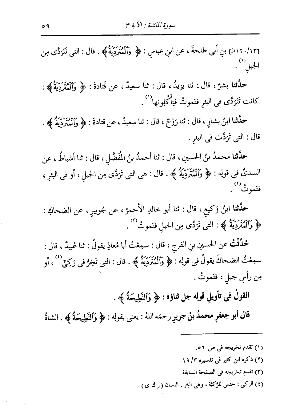 حَدَّثَنَا ابْنُ بَشَّارٍ , قَالَ: ثنا رَوْحٌ , قَالَ: ثنا سَعِيدٌ , عَنْ قَتَادَةَ: {§وَالْمُتَرَدِّيَةُ} [المائدة: 3] قَالَ: «الَّتِي تَرَدَّتْ فِي الْبِئْرِ»