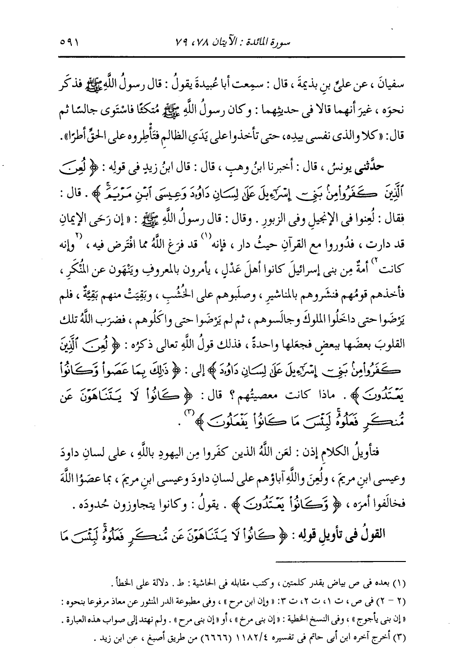 حَدَّثَنِي يُونُسُ , قَالَ: أَخْبَرَنَا ابْنُ وَهْبٍ , قَالَ: قَالَ ابْنُ زَيْدٍ فِي قَوْلِهِ: {§لُعِنَ الَّذِينَ كَفَرُوا مِنْ بَنِي إِسْرَائِيلَ عَلَى لِسَانِ دَاوُدَ وَعِيسَى ابْنِ مَرْيَمَ} قَالَ: " فَقَالَ: لُعِنُوا فِي الْإِنْجِيلِ وَفِي الزَّبُورِ. وَقَالَ: قَالَ رَسُولُ اللَّهِ صَلَّى اللهُ عَلَيْهِ وَسَلَّمَ: «إِنَّ رَحَى الْإِيمَانِ قَدْ دَارَتْ , فَدُورُوا مَعَ الْقُرْآنِ حَيْثُ دَارَ , فَإِنَّهُ قَدْ فَرَغَ اللَّهُ مِمَّا افْتَرَضَ فِيهِ , وَإِنَّهُ كَانَتْ أُمَّةٌ مِنْ بَنِي إِسْرَائِيلَ كَانُوا أَهْلَ عَدْلٍ , يَأْمُرُونَ بِالْمَعْرُوفِ وَيَنْهَوْنَ عَنِ الْمُنْكَرِ , فَأَخَذَهُمْ قَوْمُهُمْ فَنَشَرُوهُمْ بِالْمَنَاشِيرِ , وَصَلَبُوهُمْ عَلَى الْخَشَبِ , وَبَقِيَتْ مِنْهُمْ بَقِيَّةٌ , فَلَمْ يَرْضَوْا حَتَّى دَاخَلُوا الْمُلُوكَ وَجَالَسُوهُمْ , ثُمَّ لَمْ يَرْضَوْا حَتَّى وَاكَلُوهُمْ , فَضَرَبَ اللَّهُ تِلْكَ الْقُلُوبَ بَعْضَهَا بِبَعْضٍ فَجَعَلَهَا وَاحِدَةً» فَذَلِكَ قَوْلُ اللَّهِ تَعَالَى: {لُعِنَ الَّذِينَ كَفَرُوا مِنْ بَنِي إِسْرَائِيلَ عَلَى لِسَانِ دَاوُدَ} إِلَى {ذَلِكَ بِمَا عَصَوْا وَكَانُوا يَعْتَدُونَ} [البقرة: 61] مَاذَا كَانَتْ مَعْصِيَتُهُمْ؟ قَالَ: «كَانُوا لَا يَتَنَاهَوْنَ عَنْ مُنْكَرٍ فَعَلُوهُ , لَبِئْسَ مَا كَانُوا يَفْعَلُونَ» فَتَأْوِيلُ الْكَلَامِ إِذَنْ: لَعَنَ اللَّهُ الَّذِينَ كَفَرُوا مِنَ الْيَهُودِ بِاللَّهِ عَلَى لِسَانِ دَاوُدَ وَعِيسَى ابْنِ مَرْيَمَ , وَلُعِنَ وَاللَّهِ آبَاؤُهُمْ عَلَى لِسَانِ دَاوُدَ وَعِيسَى ابْنِ مَرْيَمَ , بِمَا عَصَوُا اللَّهَ فَخَالَفُوا أَمْرَهُ وَكَانُوا يَعْتَدُونَ , يَقُولُ: وَكَانُوا يَتَجَاوَزُونَ حُدُودَهُ