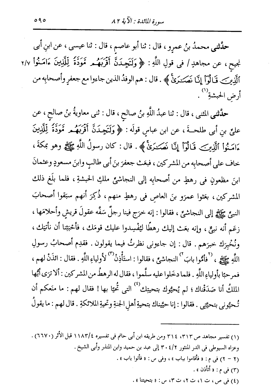 حَدَّثَنِي الْمُثَنَّى، قَالَ: ثنا عَبْدُ اللَّهِ بْنُ صَالِحٍ، قَالَ: ثنا مُعَاوِيَةُ بْنُ صَالِحٍ، عَنْ عَلِيِّ بْنِ أَبِي طَلْحَةَ، عَنِ ابْنِ عَبَّاسٍ: {ولَتَجِدَنَّ أَقْرَبَهُمْ مَوَدَّةً لِلَّذِينَ آمَنُوا الَّذِينَ قَالُوا إِنَّا نَصَارَى} [المائدة: 82] ، قَالَ: " §كَانَ رَسُولُ اللَّهِ صَلَّى اللهُ عَلَيْهِ وَسَلَّمَ وَهُوَ بِمَكَّةَ خَافَ عَلَى أَصْحَابِهِ مِنَ الْمُشْرِكِينَ، فَبَعَثَ جَعْفَرَ بْنَ أَبِي طَالِبٍ وَابْنَ مَسْعُودٍ وَعُثْمَانَ بْنَ مَظْعُونٍ فِي رَهْطٍ مِنْ أَصْحَابِهِ إِلَى النَّجَاشِيِّ مَلِكِ الْحَبَشَةِ، فَلَمَّا بَلَغَ ذَلِكَ الْمُشْرِكِينَ، بَعَثُوا عَمْرَو بْنَ الْعَاصِ فِي رَهْطٍ مِنْهُمْ، ذَكَرَ أَنَّهُمْ سَبَقُوا أَصْحَابَ النَّبِيِّ صَلَّى اللهُ عَلَيْهِ وَسَلَّمَ إِلَى النَّجَاشِيِّ، فَقَالُوا: إِنَّهُ خَرَجَ فِينَا رَجُلٌ سَفَّهَ عُقُولَ قُرَيْشٍ وَأَحْلَامَهَا، زَعَمَ أَنَّهُ نَبِيُّ، وَإِنَّهُ بَعَثَ إِلَيْكَ رَهْطًا لِيُفْسِدُوا عَلَيْكَ قَوْمَكَ، فَأَحْبَبْنَا أَنْ نَأْتِيَكَ وَنُخْبِرَكَ خَبَرَهُمْ. قَالَ: إِنْ جَاءوُنِي نَظَرْتُ فِيمَا يَقُولُونَ. فَقَدِمَ أَصْحَابُ رَسُولِ اللَّهِ صَلَّى اللهُ عَلَيْهِ وَسَلَّمَ، فَأَقَامُوا بِبَابِ النَّجَاشِيِّ فَقَالُوا: أَتَأْذَنُ لِأَوْلِيَاءِ اللَّهِ؟ فَقَالَ: ائْذَنْ لَهُمْ، فَمَرْحَبًا بِأَوْلِيَاءِ اللَّهِ، فَلَمَّا دَخَلُوا عَلَيْهِ سَلَّمُوا، فَقَالَ لَهُ الرَّهْطُ مِنَ الْمُشْرِكِينَ: أَلَا تَرَى أَيُّهَا الْمَلِكُ أَنَّا صَدَقْنَاكَ، لَمْ يُحَيُّوكَ بِتَحِيَّتِكَ الَّتِي تُحَيَّا بِهَا؟ فَقَالَ لَهُمْ: مَا مَنَعَكُمْ أَنْ تُحَيُّونِي بِتَحِيَّتِي؟ فَقَالُوا: إِنَّا حَيَّيْنَاكَ بِتَحِيَّةِ أَهْلِ الْجَنَّةِ وَتَحِيَّةِ الْمَلَائِكَةِ. قَالَ لَهُمْ: مَا يَقُولُ -[596]- صَاحِبُكُمْ فِي عِيسَى وَأُمِّهِ؟ قَالَ: يَقُولُ: هُوَ عَبْدُ اللَّهِ وَكَلِمَةٌ مِنَ اللَّهِ أَلْقَاهَا إِلَى مَرْيَمَ، وَرُوحٌ مِنْهُ، وَيَقُولُ فِي مَرْيَمَ: إِنَّهَا الْعَذْرَاءُ الْبَتُولُ. قَالَ: فَأَخَذَ عُودًا مِنَ الْأَرْضِ فَقَالَ: مَا زَادَ عِيسَى وَأُمُّهُ عَلَى مَا قَالَ صَاحِبُكُمْ قَدْرَ هَذَا الْعُودِ، فَكَرِهَ الْمُشْرِكُونَ قَوْلَهُ، وَتَغَيَّرَتْ وجُوهُهُمْ. قَالَ لَهُمْ: هَلْ تَعْرِفُونَ شَيْئًا مِمَّا أُنْزِلَ عَلَيْكُمْ؟ قَالُوا: نَعَمْ. قَالَ: اقْرَءُوا، فَقَرَؤُوا، وَهُنَالِكَ مِنْهُمْ قِسِّيسُونَ وَرُهْبَانٌ وَسَائِرُ النَّصَارَى، فَعَرَفَتْ كُلَّ مَا قَرَأُوا، وَانْحَدَرَتْ دُمُوعُهُمْ مِمَّا عَرَفُوا مِنَ الْحَقِّ. قَالَ اللَّهُ تَعَالَى ذِكْرُهُ: {ذَلِكَ بِأَنَّ مِنْهُمْ قِسِّيسِينَ وَرُهْبَانًا وَأَنَّهُمْ لَا يَسْتَكْبِرُونَ وَإِذَا سَمِعُوا مَا أُنْزِلَ إِلَى الرَّسُولِ} [المائدة: 83] الْآيَةَ "