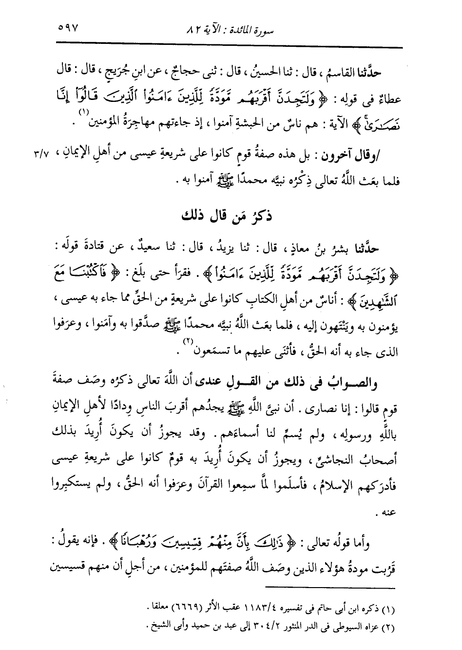 ذِكْرُ مَنْ قَالَ ذَلِكَ حَدَّثَنَا بِشْرُ بْنُ مُعَاذٍ، قَالَ: ثنا يَزِيدُ، قَالَ: ثنا سَعِيدٌ، عَنْ قَتَادَةَ، قَوْلُهُ: {ولَتَجِدَنَّ أَقْرَبَهُمْ مَوَدَّةً لِلَّذِينَ آمَنُوا} [المائدة: 82] ، فَقَرَأَ حَتَّى بَلَغَ {فَاكْتُبْنَا مَعَ الشَّاهِدِينَ} [المائدة: 83] : «§أُنَاسٌ مِنْ أَهْلِ الْكِتَابِ كَانُوا عَلَى شَرِيعَةٍ مِنَ الْحَقِّ مِمَّا جَاءَ بِهِ عِيسَى، يُؤْمِنُونَ بِهِ وَيَنْتَهُونَ إِلَيْهِ، فَلَمَّا بَعَثَ اللَّهُ نَبِيَّهُ مُحَمَّدًا صَلَّى اللهُ عَلَيْهِ وَسَلَّمَ صَدَّقُوا بِهِ وَآمَنُوا، وَعَرَفُوا الَّذِي جَاءَ بِهِ أَنَّهُ الْحَقُّ، فَأَثْنَى عَلَيْهِمْ مَا تَسْمَعُونَ» وَالصَّوَابُ فِي ذَلِكَ مِنَ الْقَوْلِ عِنْدِي أَنَّ اللَّهَ تَعَالَى وَصَفَ صِفَةَ قَوْمٍ قَالُوا: إِنَّا نَصَارَى، أَنَّ نَبِيَّ اللَّهِ صَلَّى اللهُ عَلَيْهِ وَسَلَّمَ يَجِدُهُمْ أَقْرَبَ النَّاسِ وِدَادًا لِأَهْلِ الْإِيمَانِ بِاللَّهِ وَرَسُولِهِ، وَلَمْ يُسَمِّ لَنَا أَسْمَاءَهُمْ. وَقَدْ يَجُوزُ أَنْ يَكُونَ أُرِيدَ بِذَلِكَ أَصْحَابُ النَّجَاشِيِّ، وَيَجُوزُ أَنْ يَكُونَ أُرِيدَ بِهِ قَوْمٌ كَانُوا عَلَى شَرِيعَةِ عِيسَى فَأَدْرَكَهُمُ الْإِسْلَامُ فَأَسْلَمُوا لَمَّا سَمِعُوا الْقُرْآنَ وَعَرَفُوا أَنَّهُ الْحَقُّ، وَلَمْ يَسْتَكْبِرُوا عَنْهُ