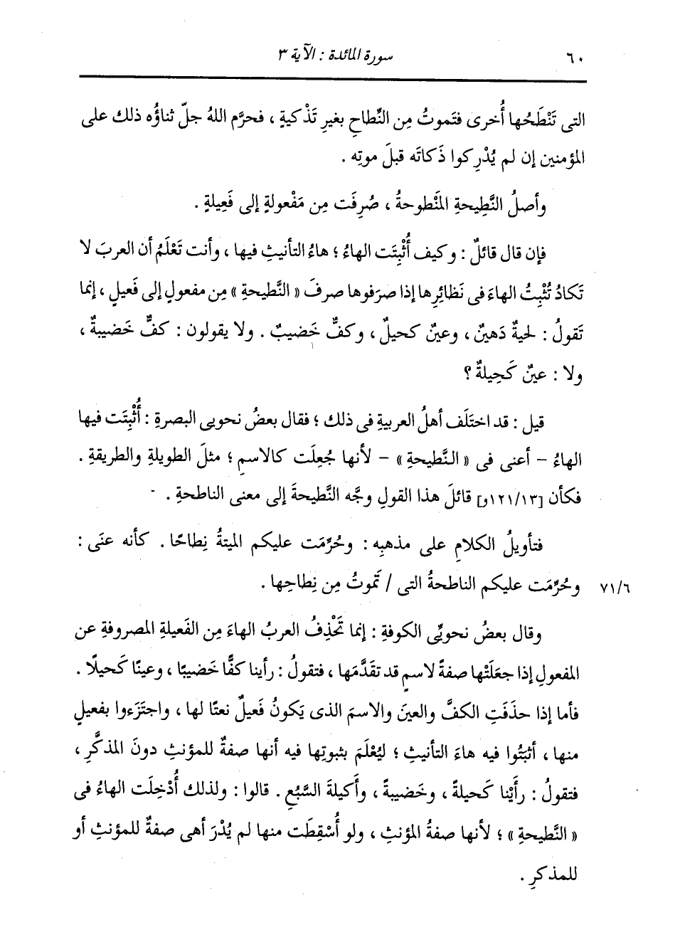 الَّتِي تَنْطَحُهَا أُخْرَى فَتَمُوتُ مِنَ النِّطَاحِ بِغَيْرِ تَذْكِيَةٍ , فَحَرَّمَ اللَّهُ جَلَّ ثَنَاؤُهُ ذَلِكَ عَلَى الْمُؤْمِنِينَ إِنْ لَمْ يُدْرِكُوا ذَكَاتَهُ قَبْلَ مَوْتِهِ. وَأَصْلُ النَّطِيحَةِ: الْمَنْطُوحَةُ , صُرِفَتْ مِنْ مَفْعُولَةٍ إِلَى فَعِيلَةٍ " فَإِنْ قَالَ قَائِلٌ: وَكَيْفَ أُثْبِتَتِ الْهَاءُ هَاءُ التَّأْنِيثِ فِيهَا , وَأَنْتَ تَعْلَمُ أَنَّ الْعَرَبَ لَا تَكَادُ تُثْبِتُ الْهَاءَ فِي نَظَائِرِهَا إِذَا صَرَفُوهَا صَرْفَ النَّطِيحَةِ مِنْ مَفْعُولٍ إِلَى فَعِيلٌ , إِنَّمَا تَقُولُ: لِحْيَةٌ دَهِينٌ , وَعَيْنٌ كَحِيلٌ , وَكَفٌّ خَضِيبٌ , وَلَا يَقُولُونَ كَفٌّ خَضِيبَةٌ وَلَا عَيْنٌ كَحِيلَةٌ؟ قِيلَ: قَدِ اخْتَلَفَتْ أَهْلُ الْعَرَبِيَّةِ فِي ذَلِكَ , فَقَالَ بَعْضُ نَحْوِيِّي الْبَصْرَةِ: أُثْبِتَتْ فِيهَا الْهَاءُ , أَعْنِي فِي النَّطِيحَةِ , لِأَنَّهَا جُعِلَتْ كَالِاسْمِ مِثْلَ الطَّوِيلَةِ وَالطَّرِيقَةِ فَكَأَنَّ قَائِلَ هَذَا الْقَوْلِ وَجَّهَ النَّطِيحَةَ إِلَى مَعْنَى النَّاطِحَةِ. فَتَأْوِيلُ الْكَلَامِ عَلَى مَذْهِبِهِ: وَحَرَّمْتُ عَلَيْكُمُ الْمَيِّتَةَ نِطَاحًا , كَأَنَّهُ عَنَى: وَحَرَّمْتُ عَلَيْكُمُ النَّاطِحَةَ الَّتِي تَمُوتُ مِنْ نِطَاحِهَا. وَقَالَ بَعْضُ نَحْوِيِّي الْكُوفَةِ: إِنَّمَا تَحْذِفُ الْعَرَبُ الْهَاءَ مِنَ الْفَعِيلَةِ الْمَصْرُوفَةِ عَنِ الْمَفْعُولِ إِذَا جَعَلَتْهَا صِفَةً لِاسْمٍ , قَدْ تَقَدَّمَهَا , فَتَقُولُ: رَأَيْنَا كَفًّا خَضِيبًا وَعَيْنًا كَحِيلًا. فَأَمَّا إِذَا حَذَفَتِ الْكَفَّ وَالْعَيْنَ وَالِاسْمَ الَّذِي يَكُونُ فَعِيلٌ نَعْتًا لَهَا وَاجْتَزَءُوا بِفَعِيلٍ مِنْهَا , أَثْبَتُوا فِيهِ هَاءَ التَّأْنِيثِ , لِيُعْلَمَ بِثُبُوتِهَا فِيهِ أَنَّهَا صِفَةٌ لِلْمُؤَنَّثِ دُونَ الْمُذَكِّرِ , فَتَقُولُ: رَأَيْنَا كَحِيلَةً وَخَضِيبَةً وَأَكِيلَةَ السَّبُعِ , قَالُوا: وَلِذَلِكَ أُدْخِلَتِ الْهَاءُ فِي النَّطِيحَةِ , لِأَنَّهَا صِفَةُ الْمُؤَنَّثِ , وَلَوْ أُسْقِطَتْ مِنْهَا لَمْ يُدْرَ أَهِيَ صِفَةُ مُؤَنَّثٍ أَوْ مُذَكَّرٍ.