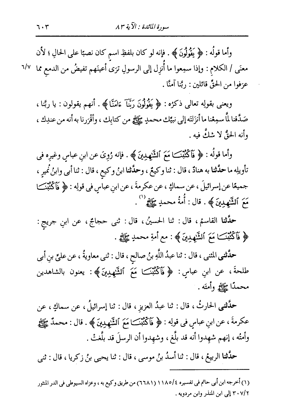 حَدَّثَنِي الْحَرْثُ قَالَ: ثنا عَبْدُ الْعَزِيزِ قَالَ: ثنا إِسْرَائِيلُ، عَنْ سِمَاكٍ، عَنْ عِكْرِمَةَ، عَنِ ابْنِ عَبَّاسٍ، فِي قَوْلِهِ: {فَاكْتُبْنَا مَعَ الشَّاهِدِينَ} [المائدة: 83] ، قَالَ: «§مُحَمَّدٍ صَلَّى اللهُ عَلَيْهِ وَسَلَّمَ وَأُمَّتِهِ، أَنَّهُمْ شَهِدُوا أَنَّهُ قَدْ بَلَّغَ، وَشَهِدُوا أَنَّ الرُّسُلَ قَدْ بَلَّغَتْ» حَدَّثَنَا الرَّبِيعُ قَالَ: ثنا أَسَدُ بْنُ مُوسَى قَالَ: ثنا يَحْيَى بْنُ زَكَرِيَّا قَالَ: ثني -[604]- إِسْرَائِيلُ، عَنْ سِمَاكٍ، عَنْ عِكْرِمَةَ، عَنِ ابْنِ عَبَّاسٍ، مِثْلَ حَدِيثِ الْحَارِثِ بْنِ عَبْدِ الْعَزِيزِ غَيْرَ أَنَّهُ قَالَ: وَشَهِدُوا لِلرُّسُلِ أَنَّهُمْ قَدْ بَلَّغُوا " فَكَأَنَّ مُتَأَوِّلَ هَذَا التَّأْوِيلِ قَصَدَ بِتَأْوِيلِهِ هَذَا إِلَى مَعْنَى قَوْلِ اللَّهِ تَعَالَى ذِكْرُهُ: {وَكَذَلِكَ جَعَلْنَاكُمْ أُمَّةً وَسَطًا لِتَكُونُوا شُهَدَاءَ عَلَى النَّاسِ وَيَكُونَ الرَّسُولُ عَلَيْكُمْ شَهِيدًا} [البقرة: 143] ، فَذَهَبَ ابْنُ عَبَّاسٍ إِلَى أَنَّ الشَّاهِدِينَ هُمُ الشُّهَدَاءُ فِي قَوْلِهِ: {لِتَكُونُوا شُهَدَاءَ عَلَى النَّاسِ} [البقرة: 143] ، وَهُمْ أُمَّةُ مُحَمَّدٍ صَلَّى اللهُ عَلَيْهِ وَسَلَّمَ وَإِذَا كَانَ التَّأْوِيلُ ذَلِكَ كَانَ مَعْنَى الْكَلَامِ: يَقُولُونَ رَبَّنَا آمَنَّا فَاكْتُبْنَا مَعَ الشَّاهِدِينَ الَّذِينَ يَشْهَدُونَ لِأَنْبِيَائِكَ يَوْمَ الْقِيَامَةِ أَنَّهُمْ قَدْ بَلَّغُوا أُمَمَهُمْ رِسَالَاتِكَ وَلَوْ قَالَ قَائِلٌ: مَعْنَى ذَلِكَ: فَاكْتُبْنَا مَعَ الشَّاهِدِينَ الَّذِينَ يَشْهَدُونَ أَنَّ مَا أَنْزَلْتَهُ إِلَى رَسُولِكَ مِنَ الْكُتُبِ حَقٌّ، كَانَ صَوَابًا لِأَنَّ ذَلِكَ خَاتِمَةُ قَوْلِهِ: {وَإِذَا سَمِعُوا مَا أُنْزِلَ إِلَى الرَّسُولِ تَرَى أَعْيُنَهُمْ تَفِيضُ مِنَ الدَّمْعِ مِمَّا عَرَفُوا مِنَ الْحَقِّ يَقُولُونَ رَبَّنَا آمَنَّا فَاكْتُبْنَا مَعَ الشَّاهِدِينَ} [المائدة: 83] ، وَذَلِكَ صِفَةٌ مِنَ اللَّهِ تَعَالَى ذِكْرُهُ لَهُمْ بِإِيمَانِهِمْ لَمَّا سَمِعُوا مِنْ كِتَابِ اللَّهِ، فَتَكُونُ مَسْأَلَتُهُمْ أَيْضًا اللَّهَ أَنْ يَجْعَلَهُمُ مِمَّنْ صَحَّتْ عِنْدَهُ شَهَادَتُهُمْ بِذَلِكَ، وَيُلْحِقُهُمْ فِي الثَّوَابِ وَالْجَزَاءِ مَنَازِلَهُمْ. وَمَعْنَى الْكِتَابِ فِي هَذَا الْمَوْضِعِ: الْجَعْلُ، يَقُولُ: فَاجْعَلْنَا مَعَ الشَّاهِدِينَ، وَأَثْبِتْنَا مَعَهُمْ فِي عِدَادِهِمْ