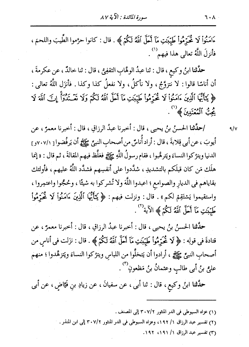 حَدَّثَنَا ابْنُ وَكِيعٍ قَالَ: ثنا عَبْدُ الْوَهَّابِ الثَّقَفِيُّ قَالَ: ثنا خَالِدٌ، عَنْ عِكْرِمَةَ: " §أَنَّ أُنَاسًا قَالُوا: لَا نَتَزَوَّجُ، وَلَا نَأْكُلُ، وَلَا نَفْعَلُ كَذَا وَكَذَا. فَأَنْزَلَ اللَّهُ تَعَالَى: {يَا أَيُّهَا الَّذِينَ آمَنُوا لَا تُحَرِّمُوا طَيِّبَاتِ مَا أَحَلَّ اللَّهُ لَكُمْ وَلَا تَعْتَدُوا إِنَّ اللَّهَ لَا يُحِبُّ الْمُعْتَدِينَ} [المائدة: 87] "